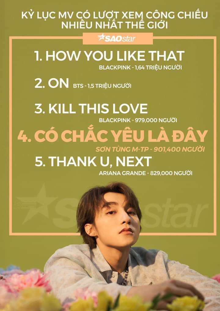 [#CoChacYeuLaDay ] سجلت 901.400 الف مشاهد خلال العرض الاول وبذلك يصبح @sontungmtp777 ثالث فنان عالمي يحقق هذا الرقم متجاوزاً اريانا جراندي.