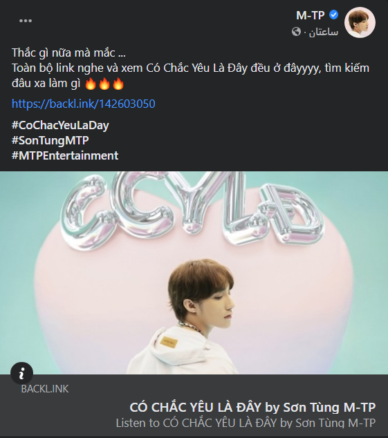 معلومة | وفقاً لـ Buzzmetrics فأن أغنية "CÓ CHẮC YÊU LÀ ĐÂY" لـ @sontungmtp777 تتصدر أفضل 10 أغانٍ مصنوعة في النصف الأول من عام 2020!