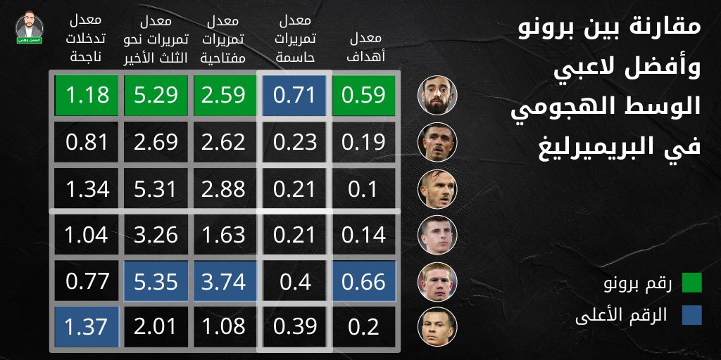 في معدل التمريرات الحاسمة يأتي برونو (0.59) مباشرة خلف كيفين #دي_بروين (0.66) وبفارق كبير عن البقية.