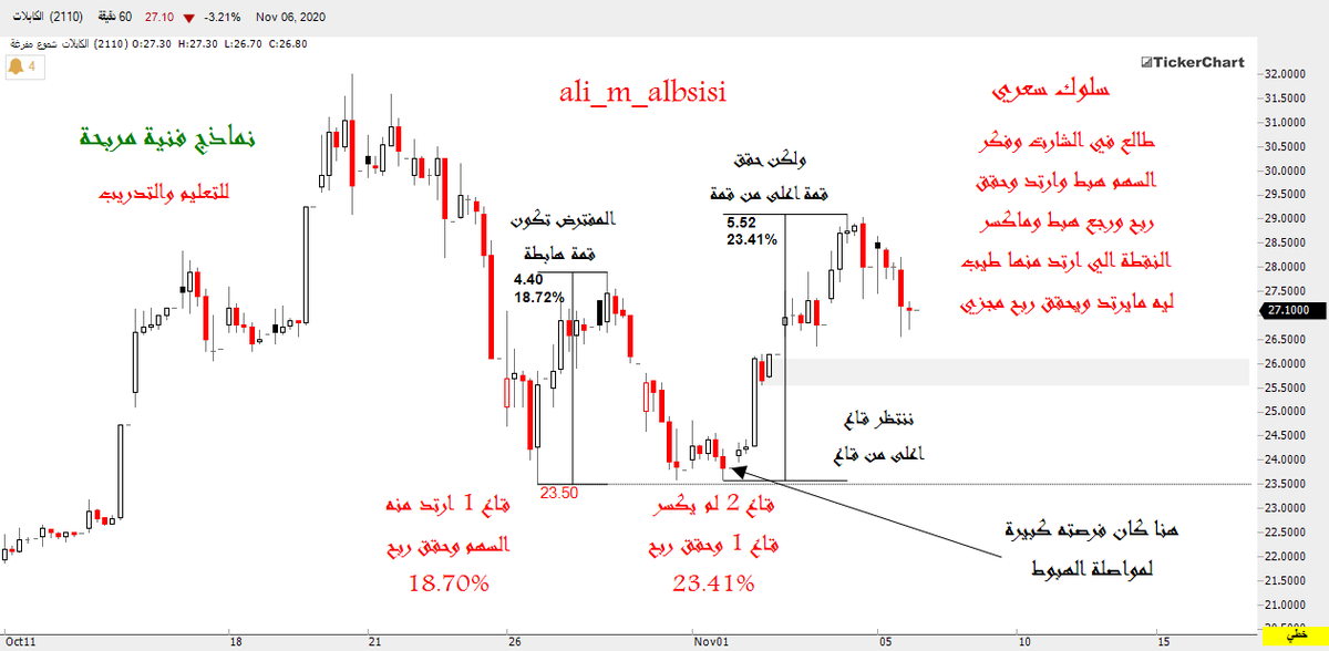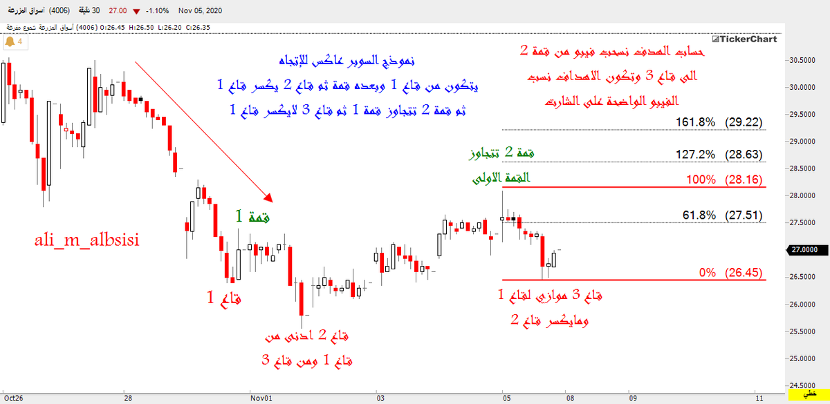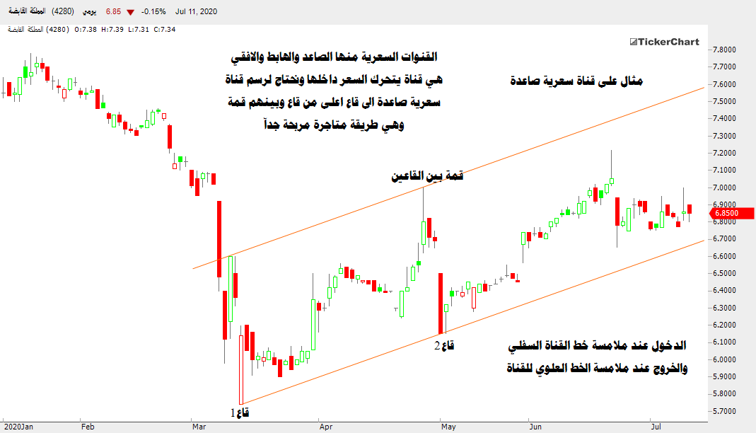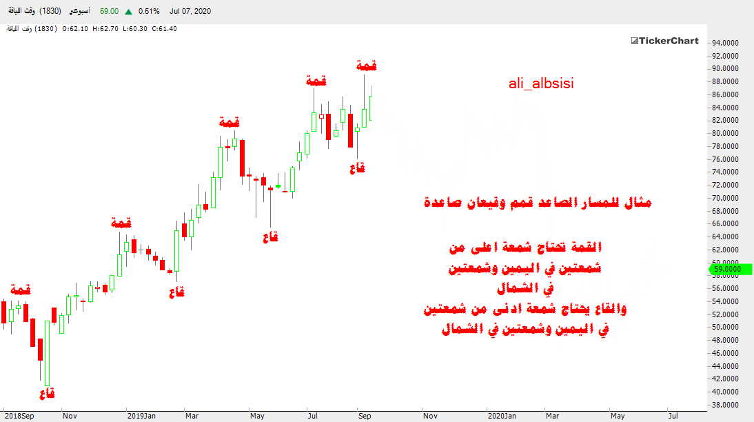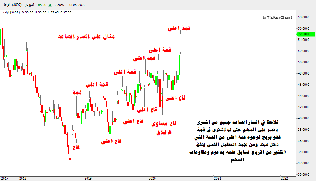 الأسهم تكون في ٣ اتجاهات اتجاه صاعد يتكون من قمم وقيعان صاعدة قمة أعلى من قمة قاع أعلى من قاع وفي هذا الاتجاه ٩٠% من المتداولين يربح لأنه مع الإتجاه الإتجاه صاعد من دون دراهمه