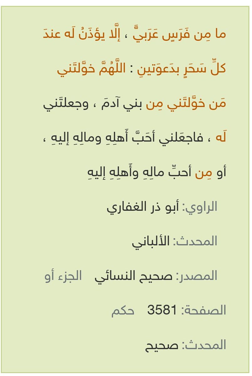 عن أبي ذر الغفاري رضي الله عنه قال: قال رسول الله صلى الله عليه وسلم: “ما مِن فَرَسٍ عَرَبيٍّ، إلَّا يؤذَنُ لَه عندَ كلِّ سَحَرٍ بدَعوَتينِ: اللَّهُمَّ خوَّلتَني مَن خوَّلتَني مِن بني آدمَ، وجعلتَني لَه، فاجعَلني أحَبَّ أَهلِهِ ومالِهِ إليهِ، أو مِن أحبِّ مالِهِ وأَهلِهِ إليهِ”👇