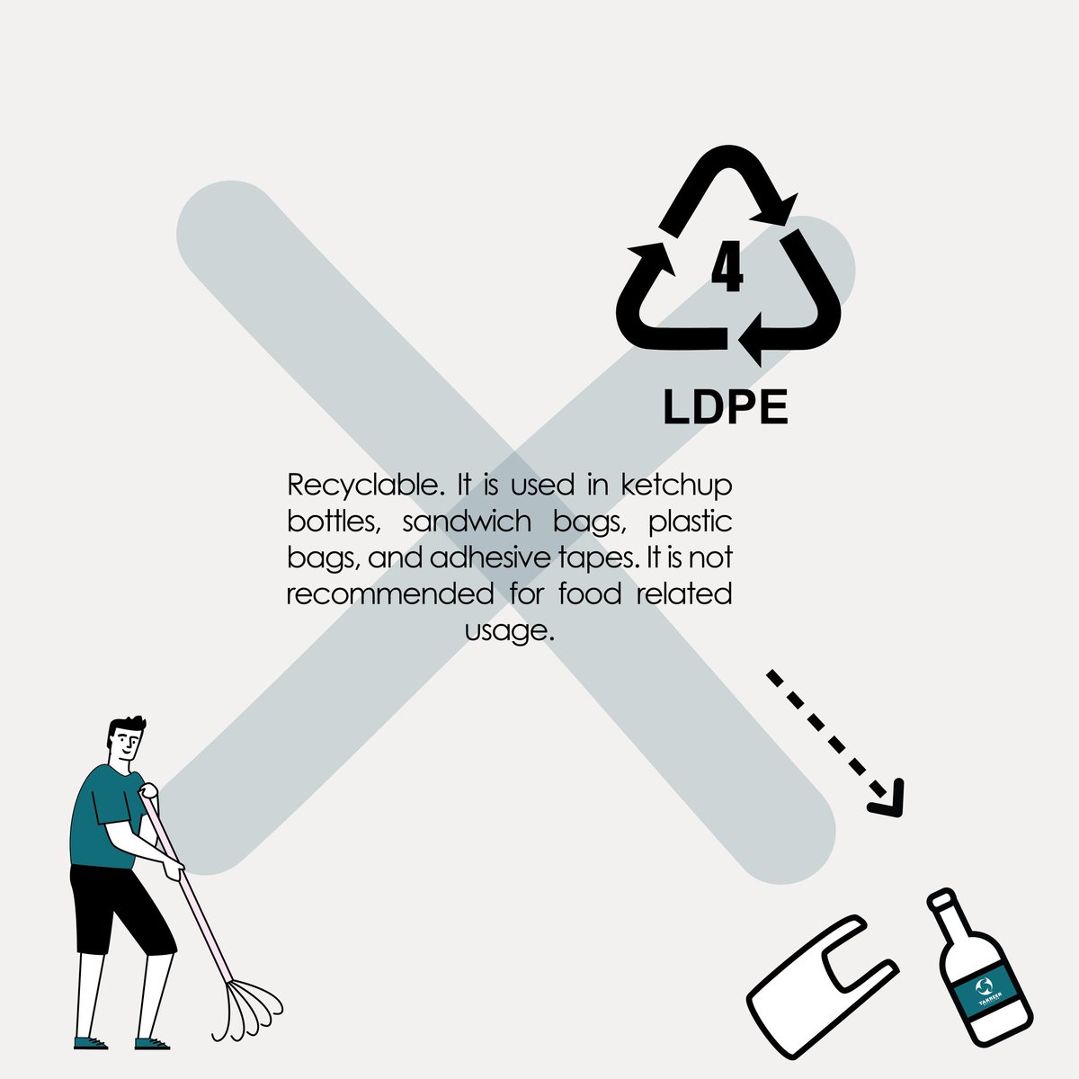 🌿 الرمز الرابع هو مايسمى إختصاراً ب LDPE.. يحمل الرقم 4 وبالطبع قابل لإعادة التدوير لكن لا ينصح بإستخدامه في الأطعمة.