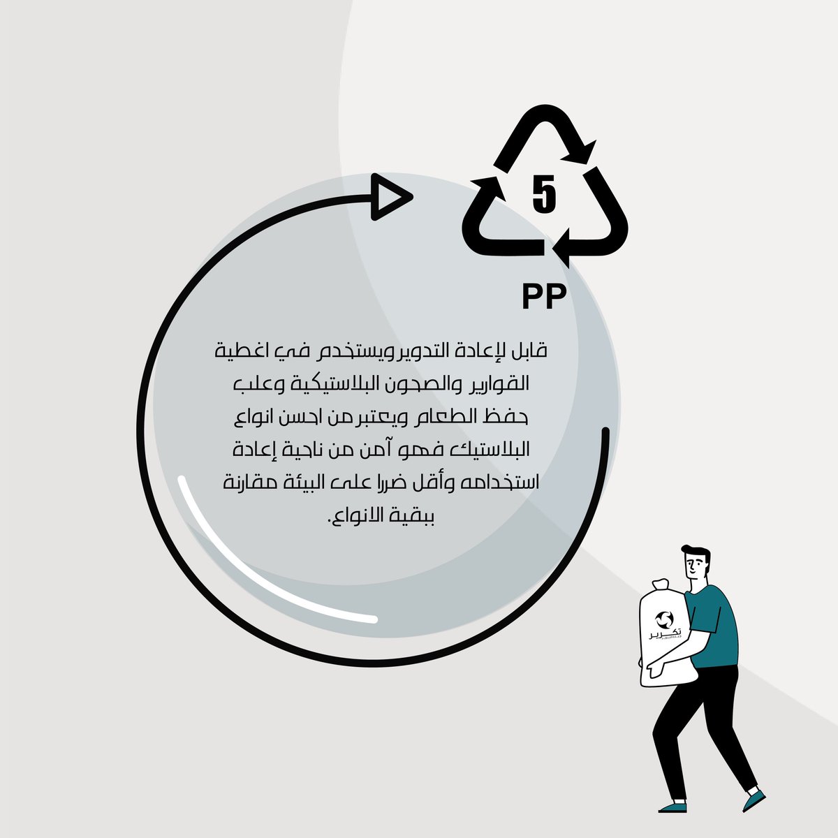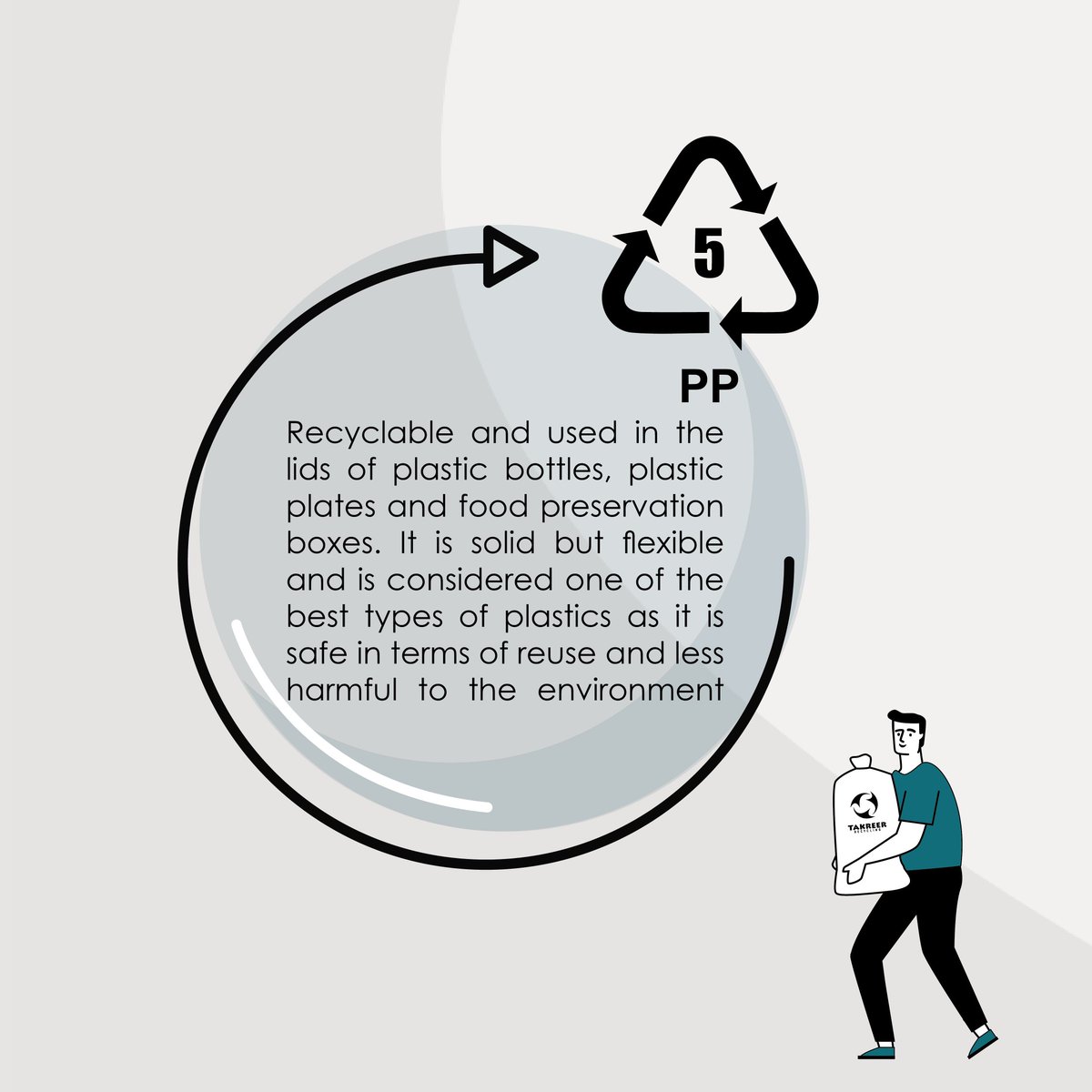 🌳 الرمز الخامس معنا يسمى إختصاراً بPP وهو من أحسن أنواع البلاستيك لأنه أقل ضرراً على البيئة من بقية الأنواع وننصح بالتأكد من وجود هذا الرمز عند شراء منتجات تحتوي على البلاستيك.