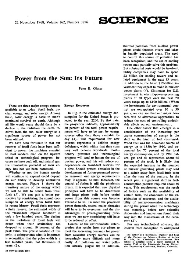وهذه الفكرة ليست وليدة هذا العصر، إنما تم طرحها أولا من قبل كاتب الخيال العلمي الشهير 'إسحاق اسيموف' في قصته القصيرة "Reason" قبل ثمانين عاماً، ليأتي بعده رائد هندسة الطيران والفضاء 'بيتر قليسور' ويطرح مقالة علمية تصف بشكل علمي حقيقي نظام توليد الطاقة الشمسية من الفضاء