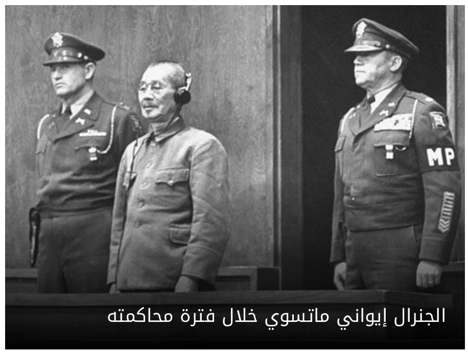 ومع نهاية الحرب العالمية الثانية، مثل الجنرال الياباني إيواني ماتسوي أمام المحكمة العسكرية الدولية للشرق الأقصى بتهمة ارتكاب جرائم حرب ليصدر في حقه حكم بالإعدام شنقًا جرى تنفيذه يوم 23 من شهر ديسمبر سنة 1948