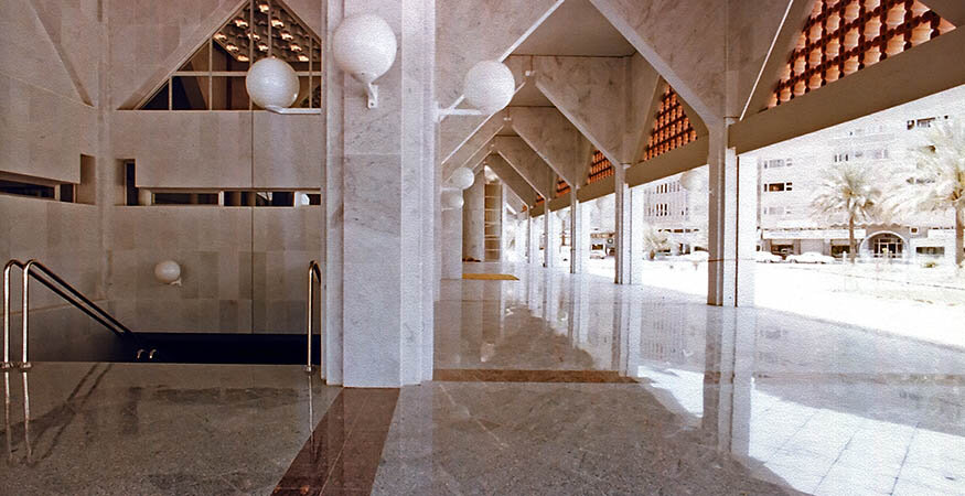 المشربيات هنا اُستخدمت كتلميحات تاريخية لعمارة المنطقة المحلية وهو أسلوب اعتدنا عليه من المعماريين الغرب الذين صمموا مشاريع في المملكة تلك الفترة.