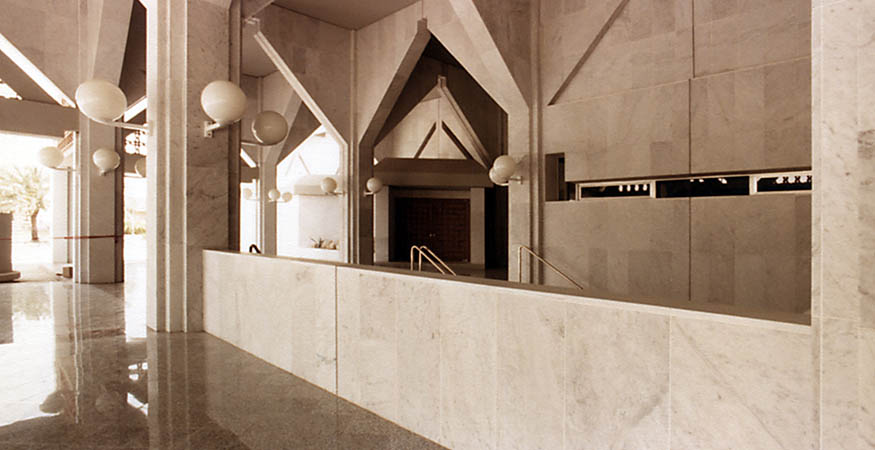 من الداخل، كرر المصمم استخدام الأشكال لأسطوانية فها هو يستخدمها في التكييف لصالة الاستقبال في إشارة على التقدم التقني الذي يعتمد عليه هذا المبنى تشغيليا وكل ذلك حدث قبل قرابة الأربعين عام.