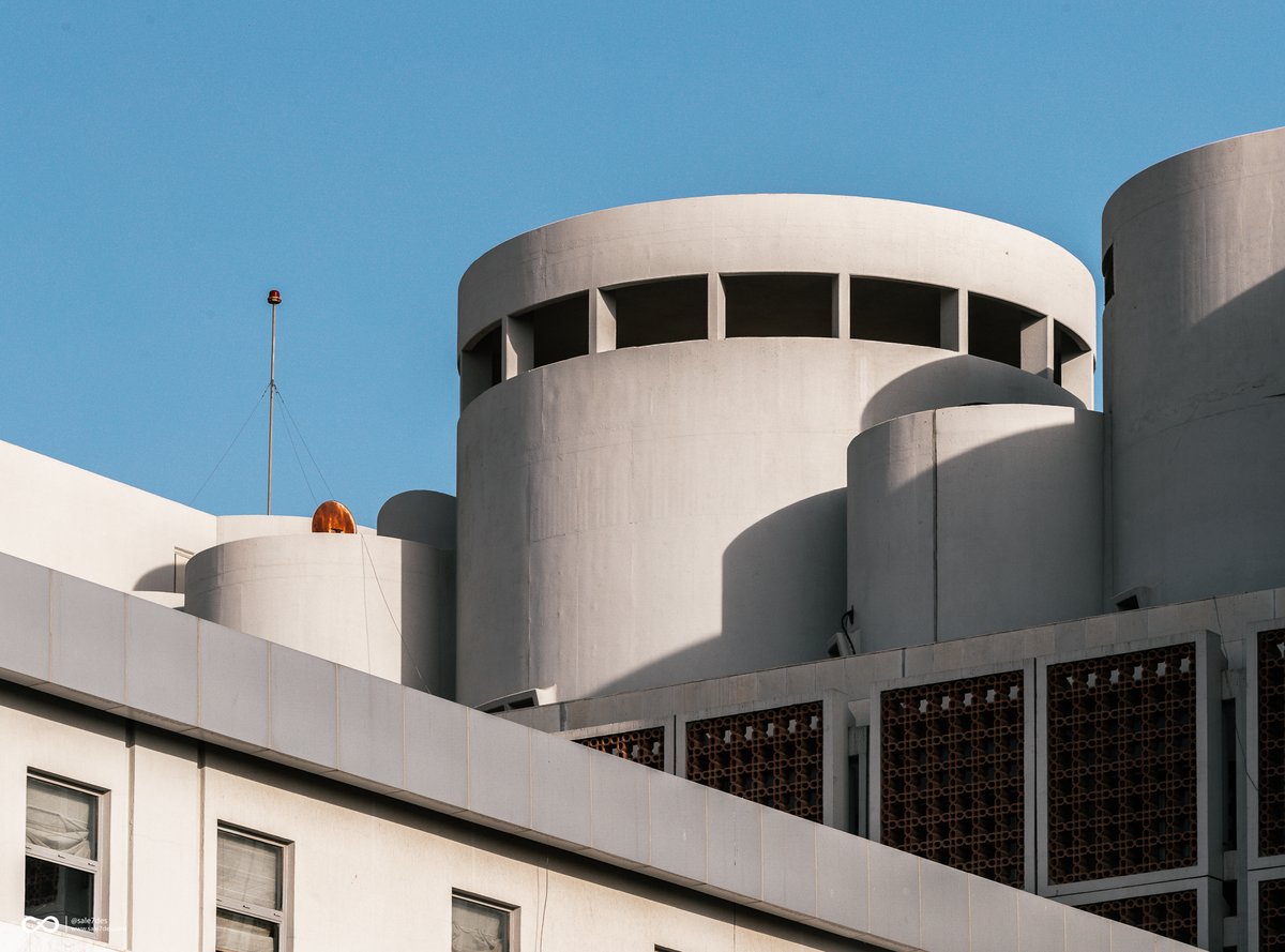الكتل الإسطوانية هذه مصمتة وخالية من الفتحات وظهرت بشكل أسطواني والأجمل من ذلك ربطها للكتل وبروزها على سطح الواجهة وارتفاعها في خط سماء المبنى.