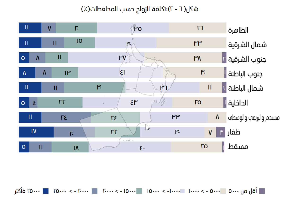 18- من بين الموضوعات التي يمكن أن يدرسها حقل #اقتصاديات_الزواج في المجتمع العُماني هو التفاوت الجغرافي في تكلفة الزواج بين المحافظات والعوامل التي تقف خلفه والآثار المترتبة عليه سواء من الناحية الاقتصادية أو الاجتماعية حيث يرى 37% من العمانيين أن تكلفة الزواج تتراوح بين 10-15 ألف