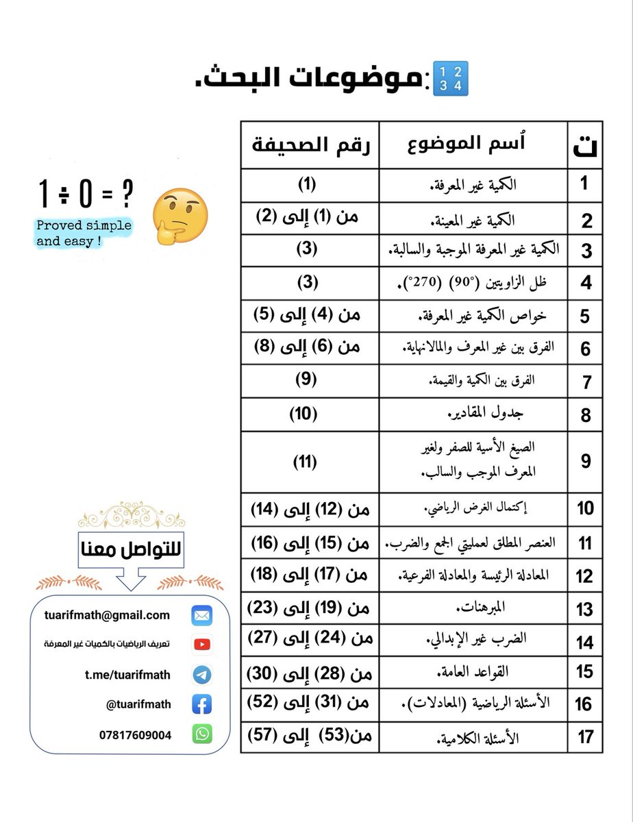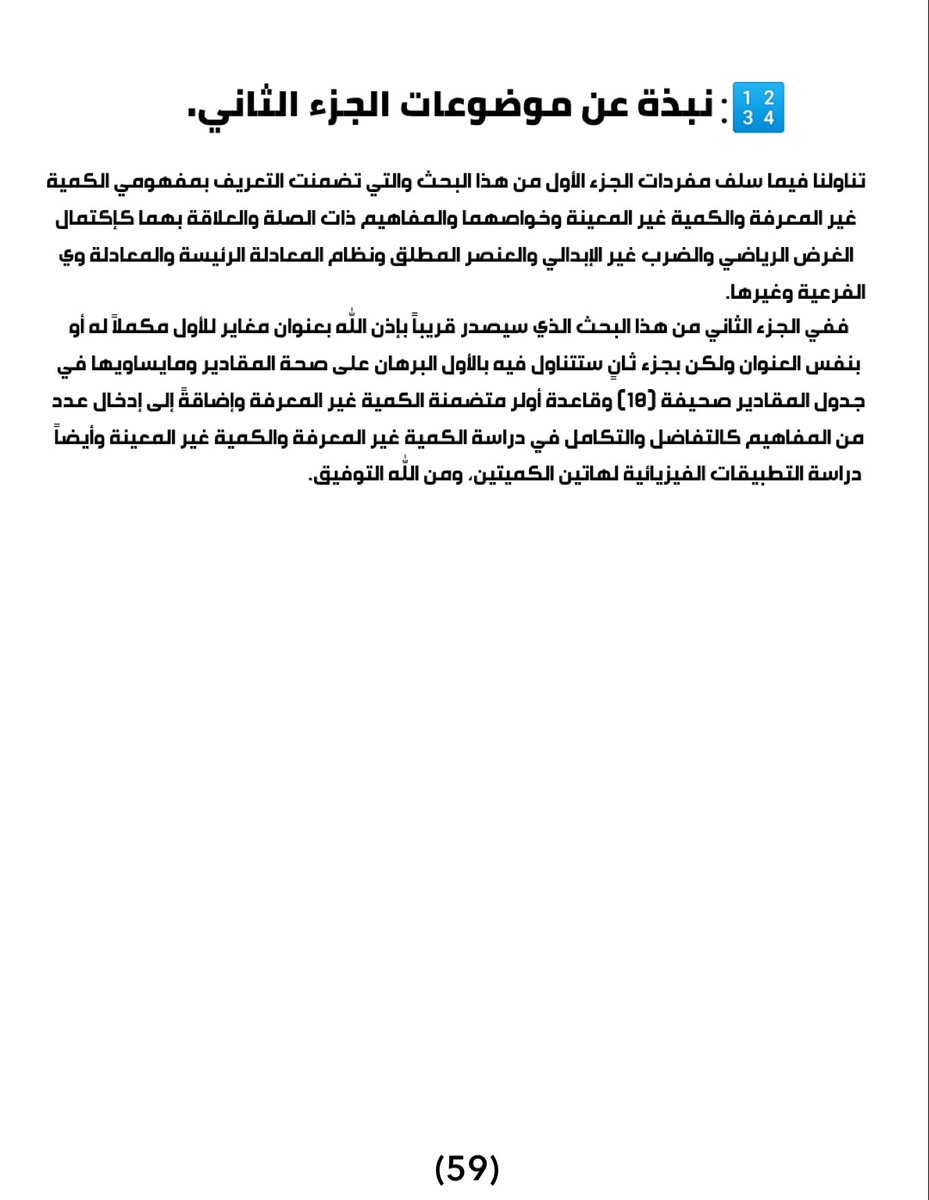 بحمد الله وببركة النبي - ص - وآله - ع - وبعد سنوات من التأليف والإعداد وأشهر من الطباعة والترتيب أضع بين أيديكم بحثي المتواضع في دراسة حول الكميات غير المعرفة والكميات غير المعينة في علم الرياضيات بجزئه الأول بعنوان: "تعريف الرياضيات بالكميات غير المعرفة".