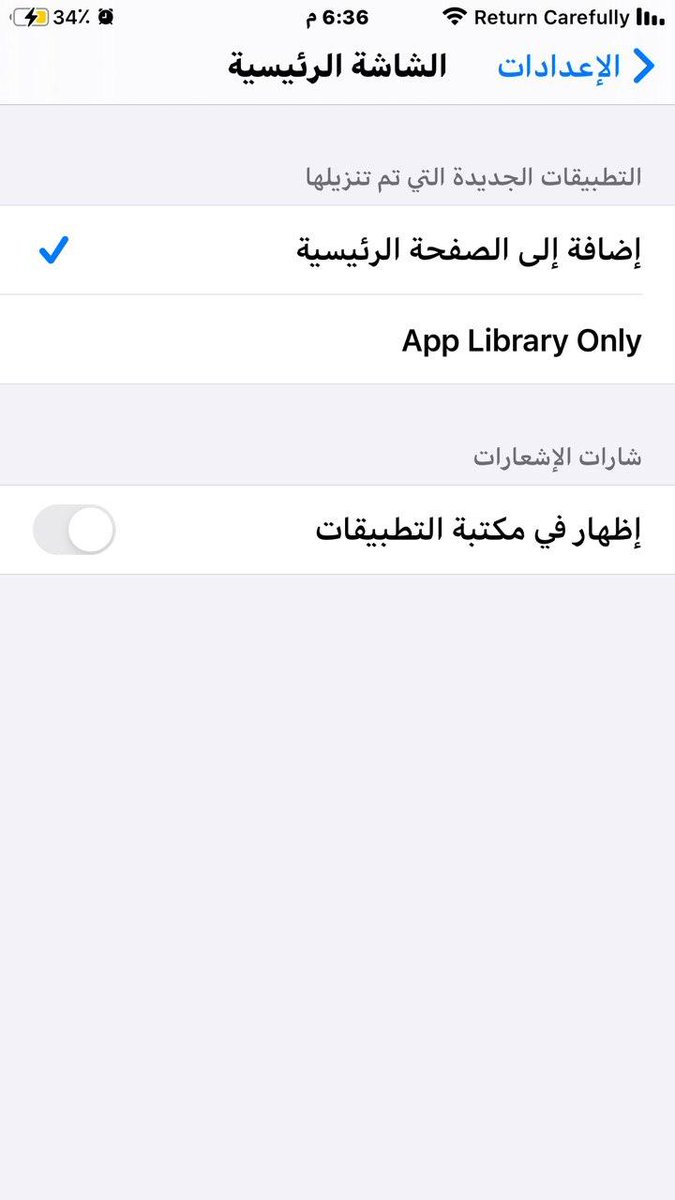 11 - في الاعدادات الان تختار هل تضاف التطبيقات الجديده اللى الصفحة الرئيسية ام مكتبة التطبيقات فقط وكذلك اظهار شارات الاشعارات في مكتبة التطبيقات