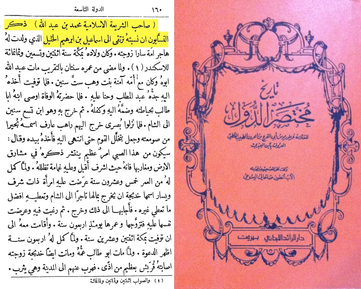 اما نسب النبي لاسماعيل بن ابراهيم -عليهم السلام-فقد أكده النسابون باعتراف الأب والمؤرخ غريغوريوس أبو الفرج(ابن العبري)