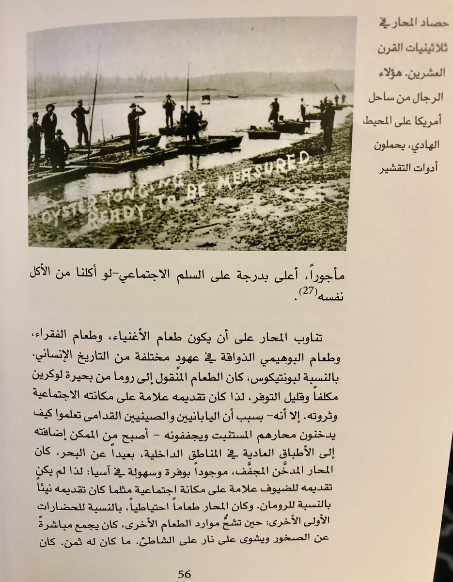 أكل المحار Oyster كان يعتبر علامة دخول المجتمع عالم الحضارة حين انتقل الطبخ من النار في العراء إلى فن المطابخ والوصفات المعقدة.