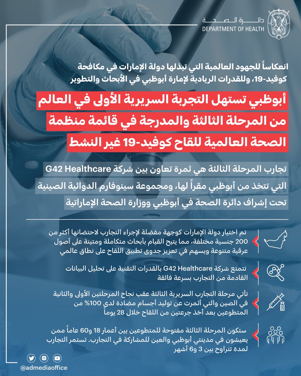 بدأت في العاصمة الإماراتية أبوظبي أولى التجارب السريرية العالمية للمرحلة الثالثة من لقاح محتمل ومدرج تحت مظلة منظمة الصحة العالمية لفيروس #كوفيد_19 غير النشط.