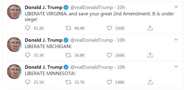 وبعدين بعد شهر تحديداً في 17/04 بطلع الرئيس دونالد ترامب بشكل مفاجئ بغرّد على تويتر ثلاثة تغريدات متتالية وهيّ: