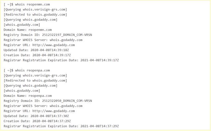 وبجانب جروبات الفيسبوك تم انشاء 540 موقع الكتروني بحمل كلمة “reopen” ومعناها "اعادة فتح" وقصدهم فتح الولايات وازالة الحظر.