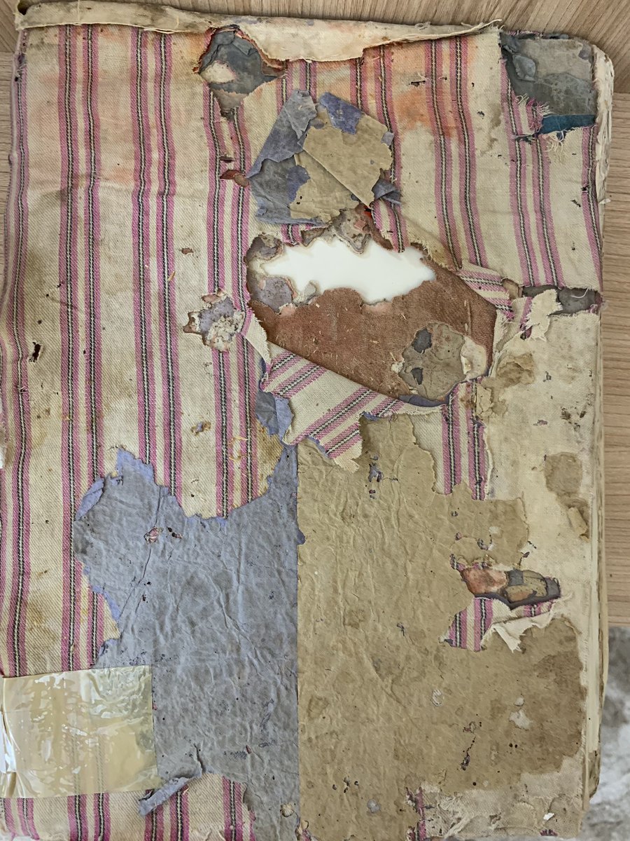 ورق مقوى مغطى بقماش أبيض فيه خطوط حمراء، وهو مهترئ.
