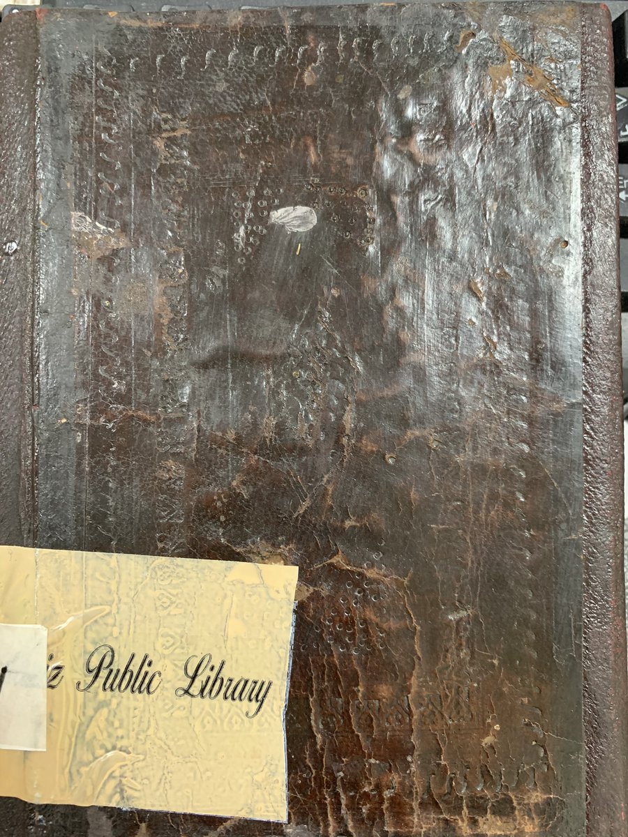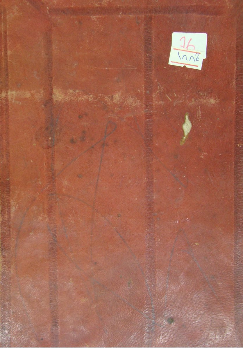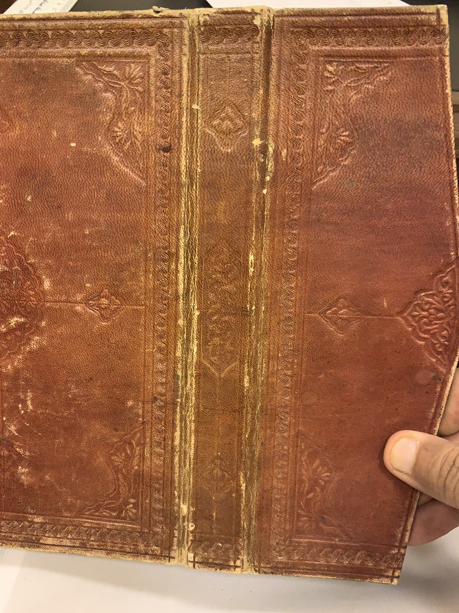 جلد بني، فيه معينات مضغوطة، كعبه مرمم بخياطة.