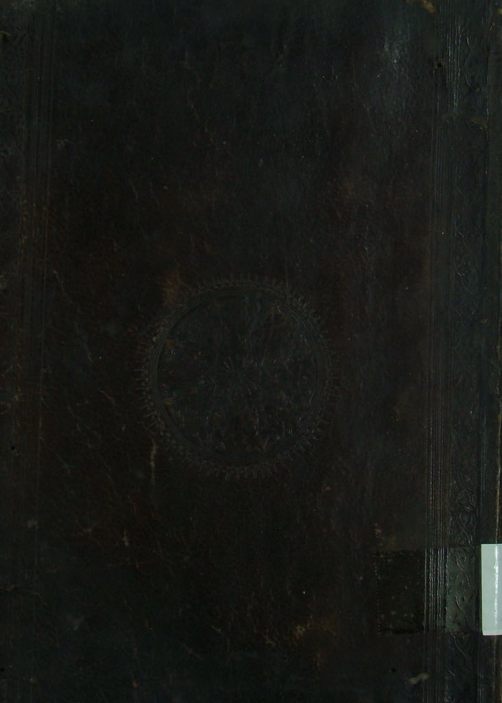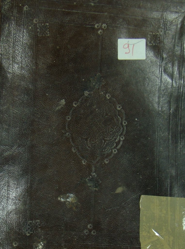 جلد بني، في وسطه ميدالية مضغوطة، مؤطر بزخارف، وله لسان.