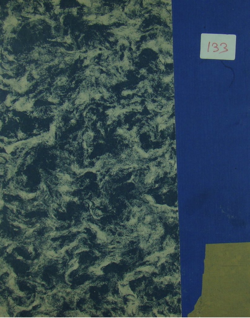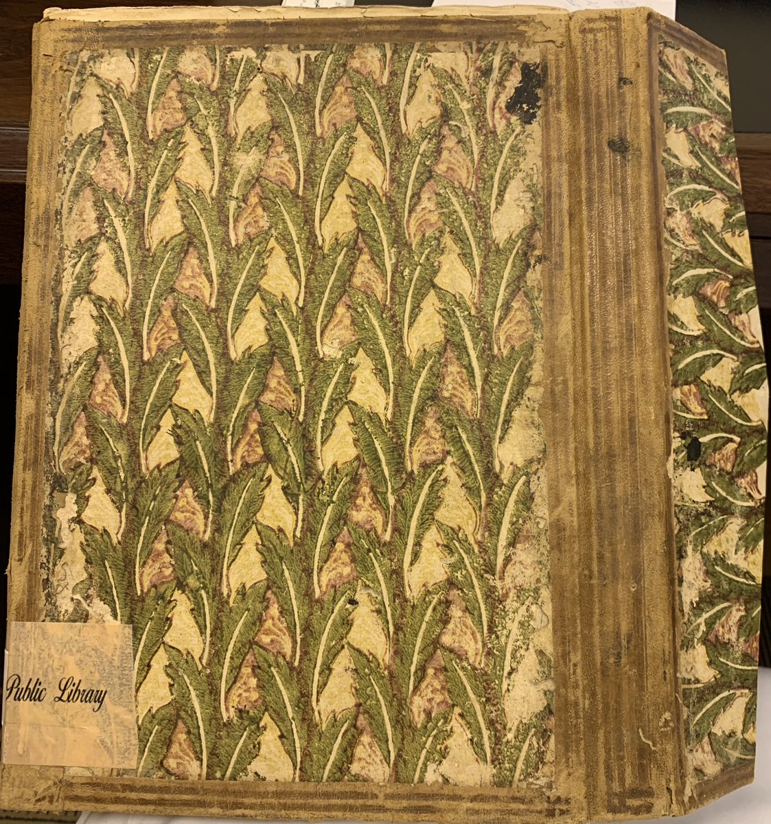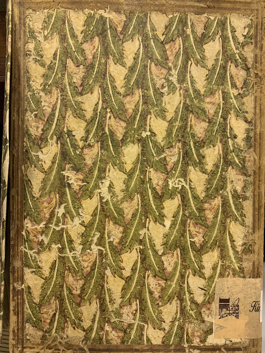 كرتوني، مغطى بورق مجزع، كعبه وكعب لسانه جلد عودي.