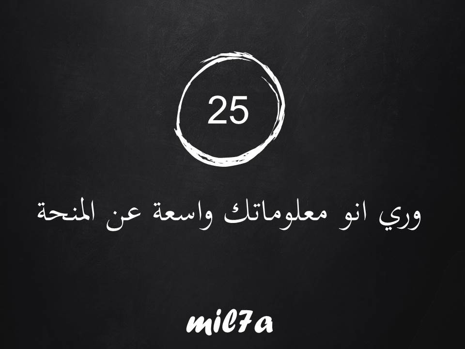 25.وري انو معلوماتك واسعة عن المنحة : اضافة معلومة خاصه بالجهة الممولة بيكون عندو فايدة كبيرة لكن اهم شي تكون ليها علاقه برسالتك مثلاً اذا المنحة ممولة عن طريق جامعة معينة ممكن تتكلم عن دور الجامعة في تطوير مجال الدراسة المقدم فيهو مثلاً