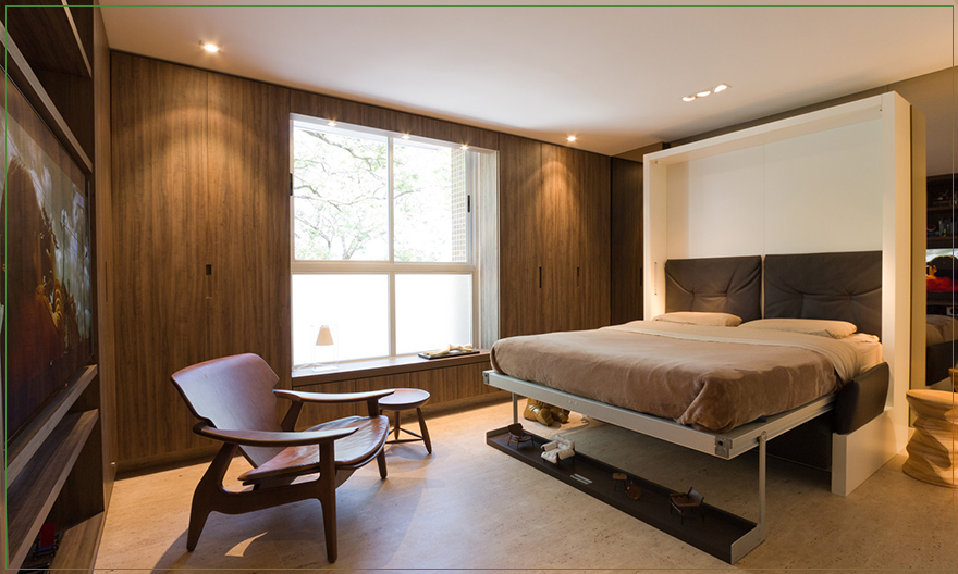 في تحدي آخر كانت مساحة الشقة أكبر قليلاً نعم 28 متر فقط! وبفضل تركيز المعماري للاستفادة من أشعة الشمس، واستخدام الأسِرَّة القابلة للطي والانزلاق المخبأة داخل جدران الشقة، تحولت إلى شقة يشار إليها بالبنان والاحترام!