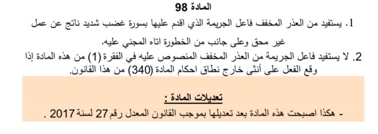 وقدمت شكاوى بحق أهلها واكتفوا بتوقيع أهلها على تعهد (تبين أنها لم تلجأ أبداً لحماية الأسرة)، ونفس التعليق طالب بإلغاء المواد ٩٨ و٩٩ من الدستور الأردني.