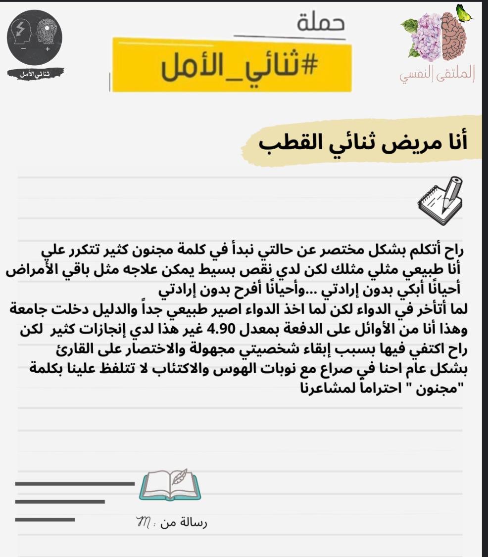 ستكون هذهِ التغريدة كساعي بريد ، لإيصال رسائل أصدقائنا أصحاب ثنائي الأمل ، إيصال حرفهم و صوتهم الموجهَ لكم كأفراد من المجتمع ، وأيضاً لأصدقائنا أصحاب ثنائي القطب في كل مكان 📩❤️.