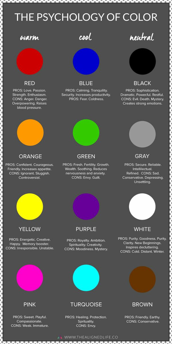الالوان لها قوة تأثر على النواحي السيكولوجية و الفيزيولجية، و تضيف بعض الصفات للمكان مثل: احساس بالانشراح في الإمكان الضيقة او الضيقة في المساحات الكبيرة او شعور بالدفء او احساس بالنشاط و الحيوية.