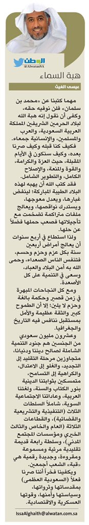 وكما قلت في تغريدة لي بتويتر إن سمو سيدي ولي العهد هو رهاننا وسيد آمالنا أيده الله بنصره، لأن الصراعات والتحالفات والتناقضات والصفقات انتهت إلى غير رجعة، ونحن اليوم نبني مستقبلنا برؤية 2030 لسعودية عظمى جديدة.