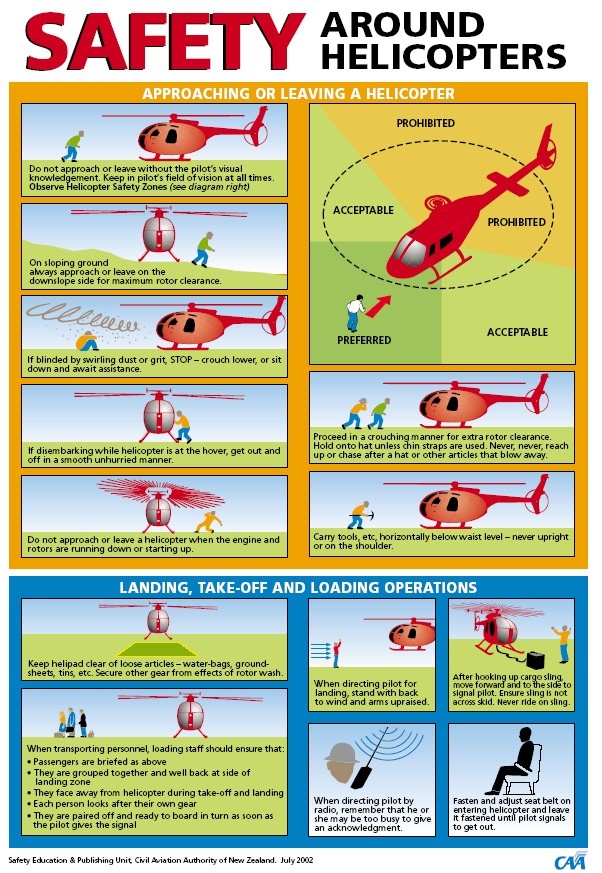 عند الاقتراب من طائرة الهليكوبتر ، يجب على الأفراد حمل جميع المعدات مثل المجارف أو الفؤوس أو الأدوات أفقياً وتحت مستوى الخصر وبقبضة ضيقة دائماً....وأبداً لا ترفع المعدات عمودياً أو فوق الكتف.