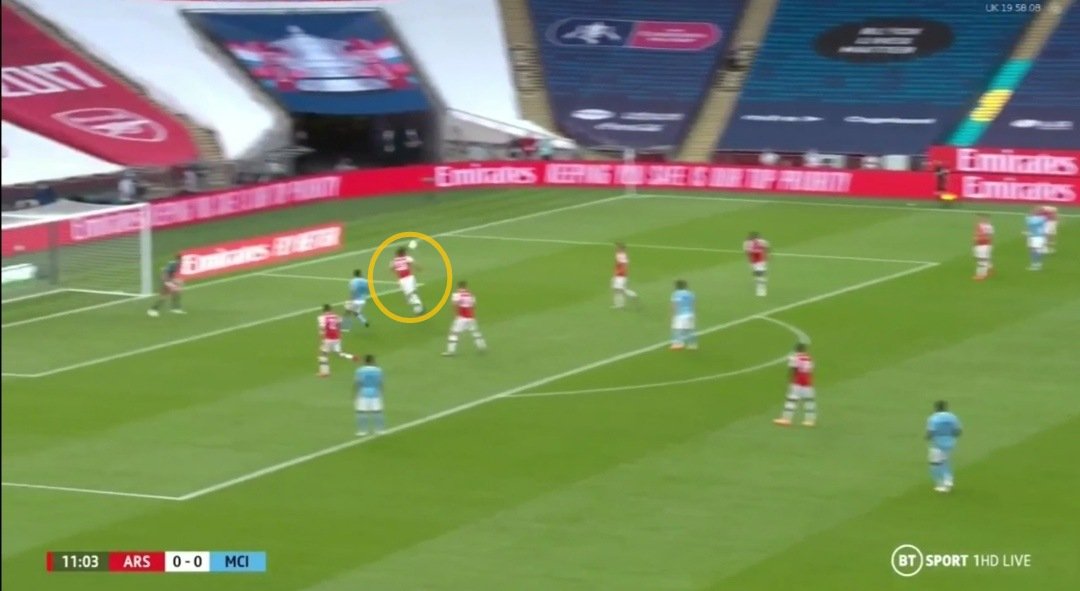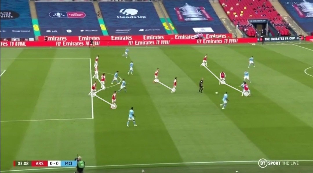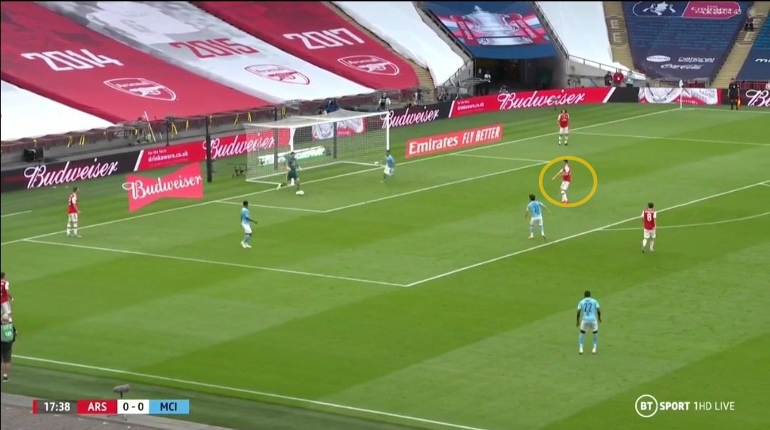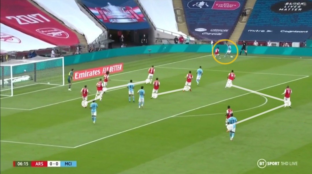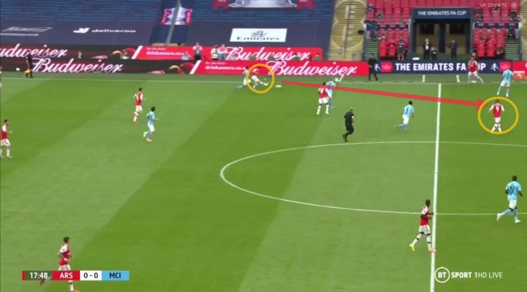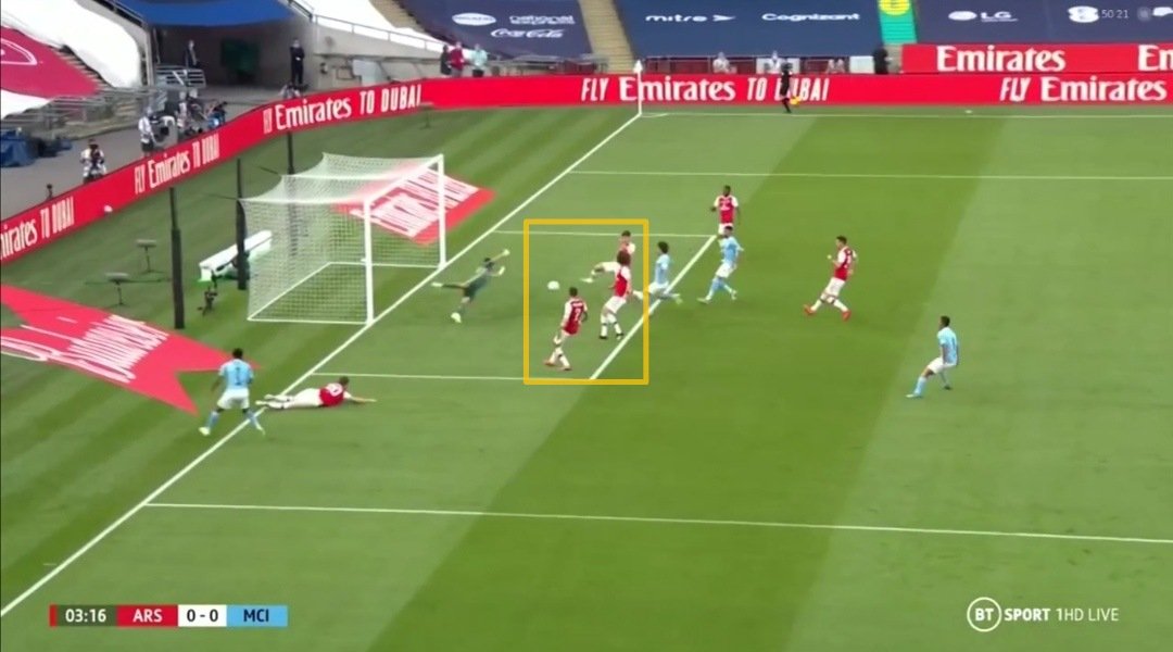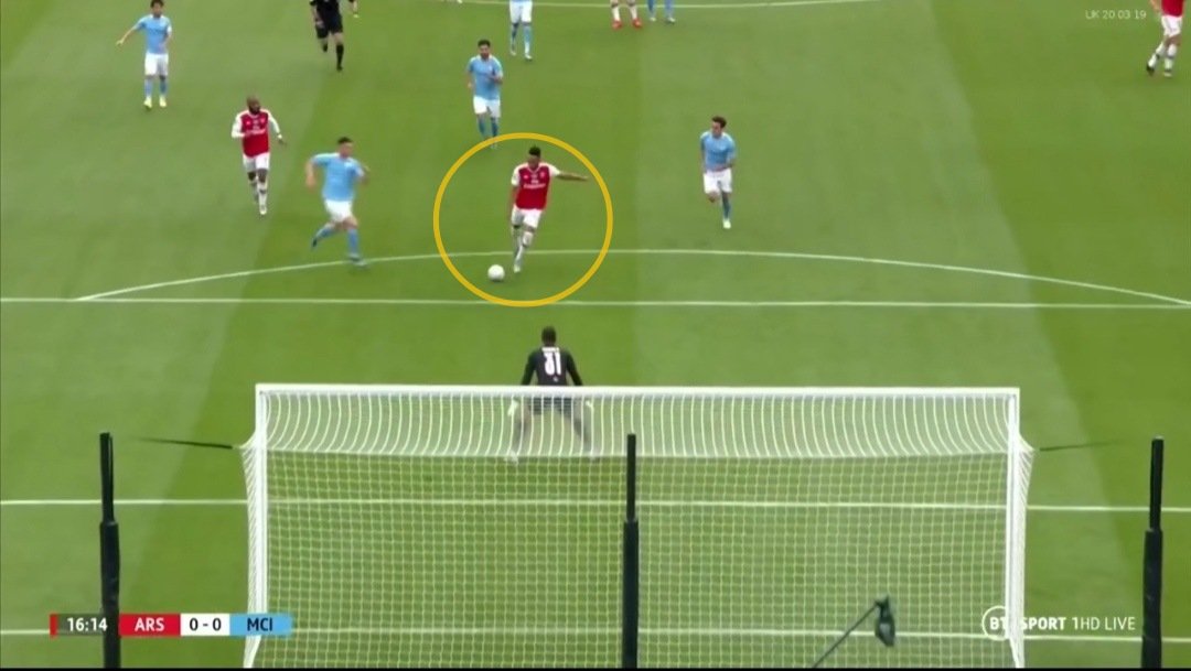 ضغط عالي، ولاعب مع لاعب، لابورت أجبر على إرسال كرة طويلة لجيسوس، رقابة لصيقة من ديفيد لويز؛ استلم الكرة ومررها في العمق إلى اوباميانج شهدت اول فرص ارسنال في المباراة