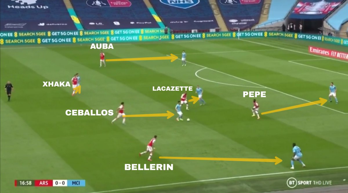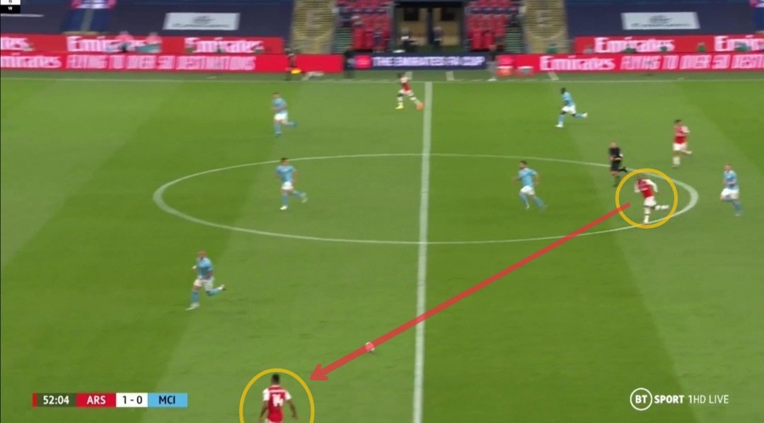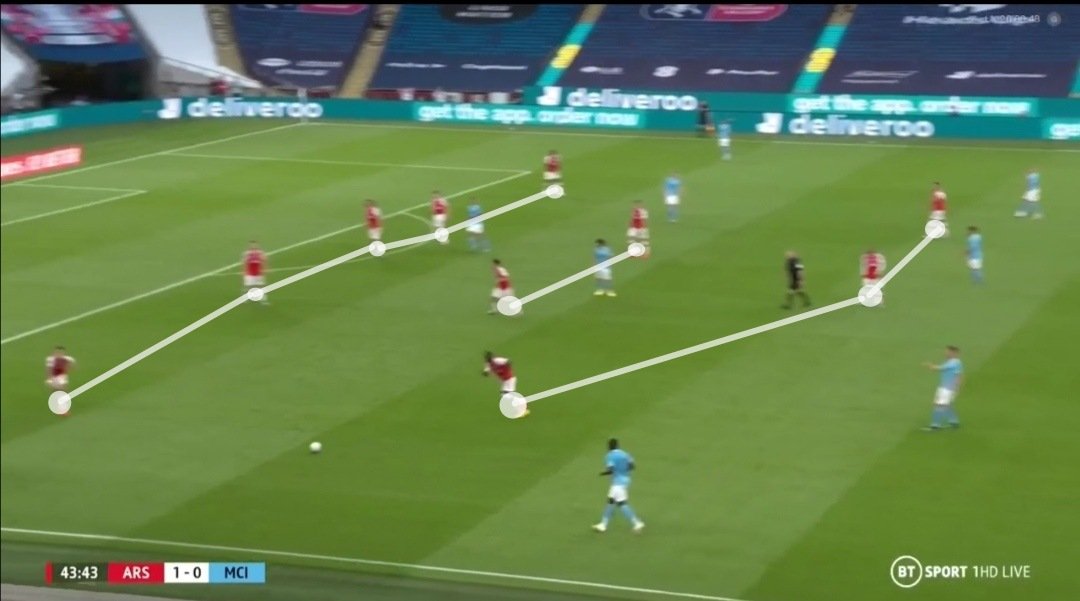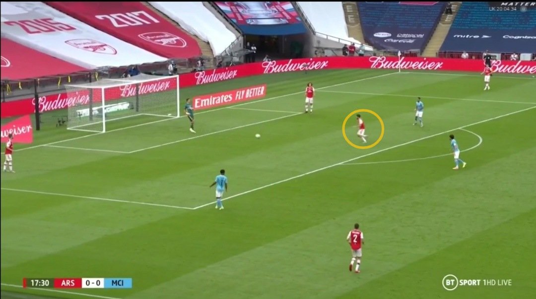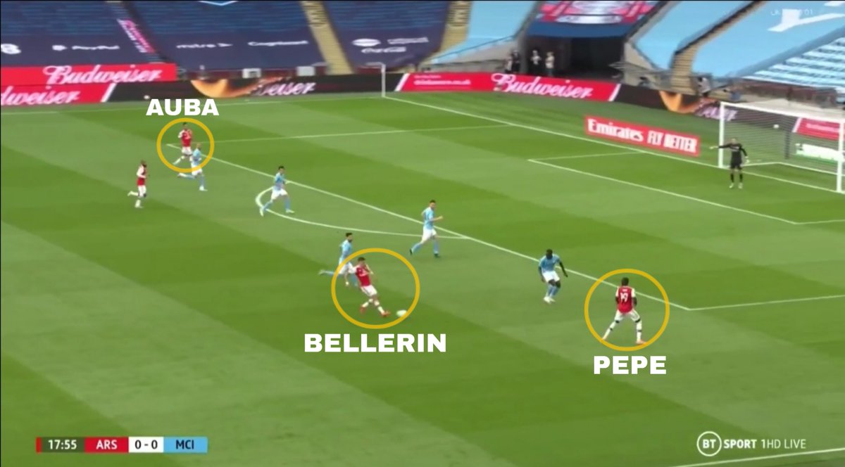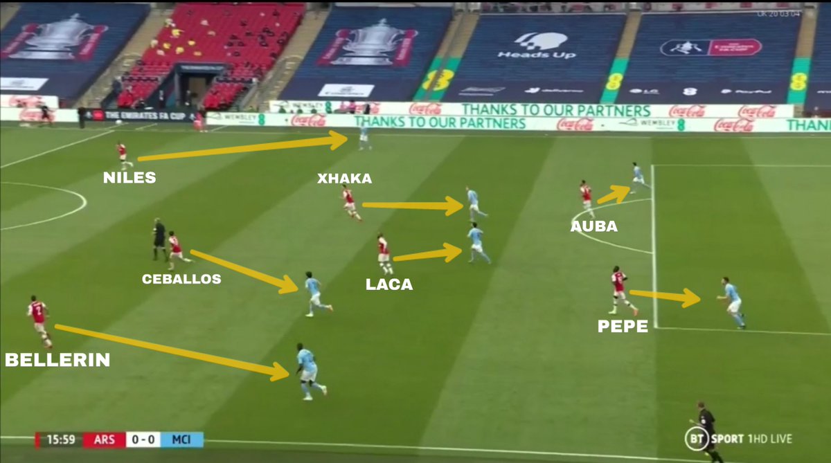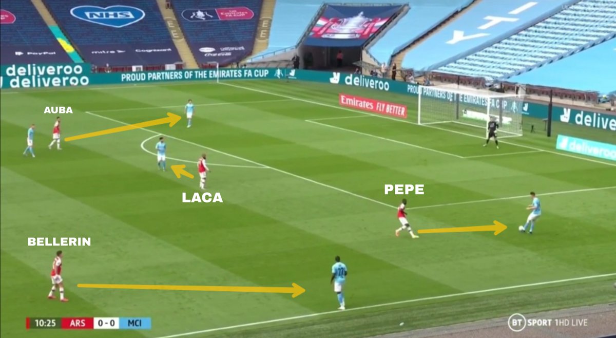ضغط عالي، ولاعب مع لاعب، لابورت أجبر على إرسال كرة طويلة لجيسوس، رقابة لصيقة من ديفيد لويز؛ استلم الكرة ومررها في العمق إلى اوباميانج شهدت اول فرص ارسنال في المباراة