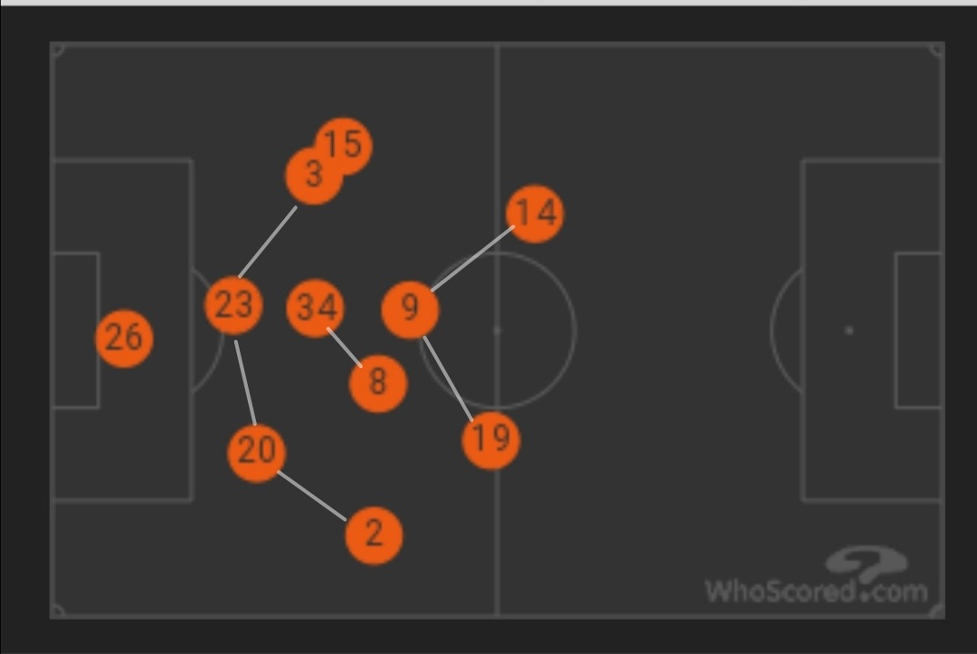 بدأت الهجمة من حارس المرمى ومساندة سيبايوس و شاكا لديفيد لويز و موستافي في بناء الهجمة من خلف، يحسب لتيرني فتحه لعرض المعلب ومنح ديفيد لويز خيار تمرير على الأطراف.