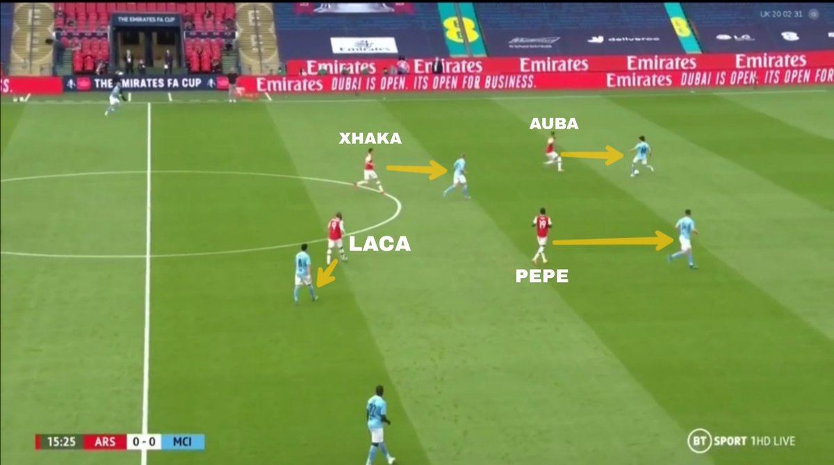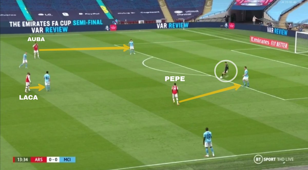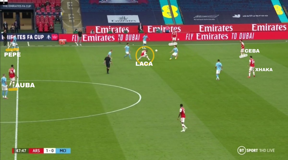 العودة خطوات للخلف، بالقرب من شاكا وسيبايوس؛ لاستلام الكرة والتمرير إلى الأمام لاوباميانح أو بيبي في العمق أو على الأطراف