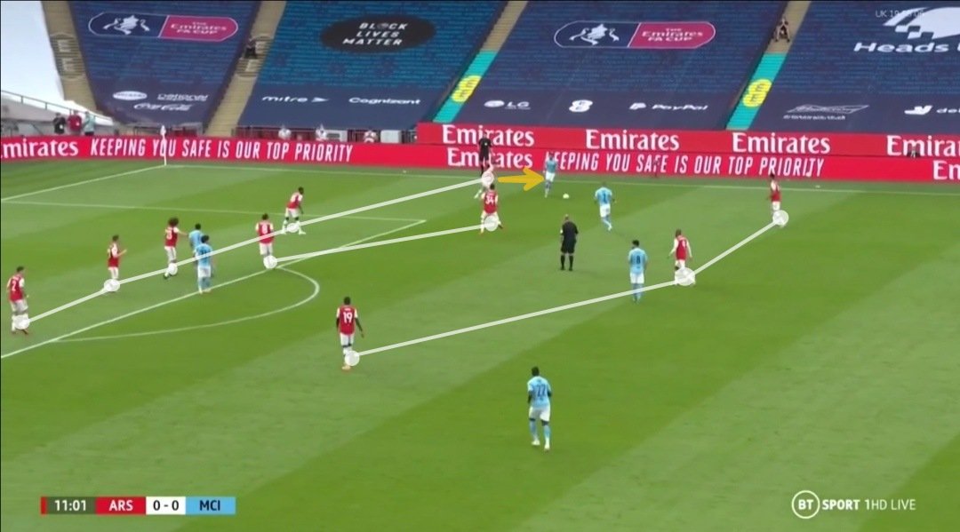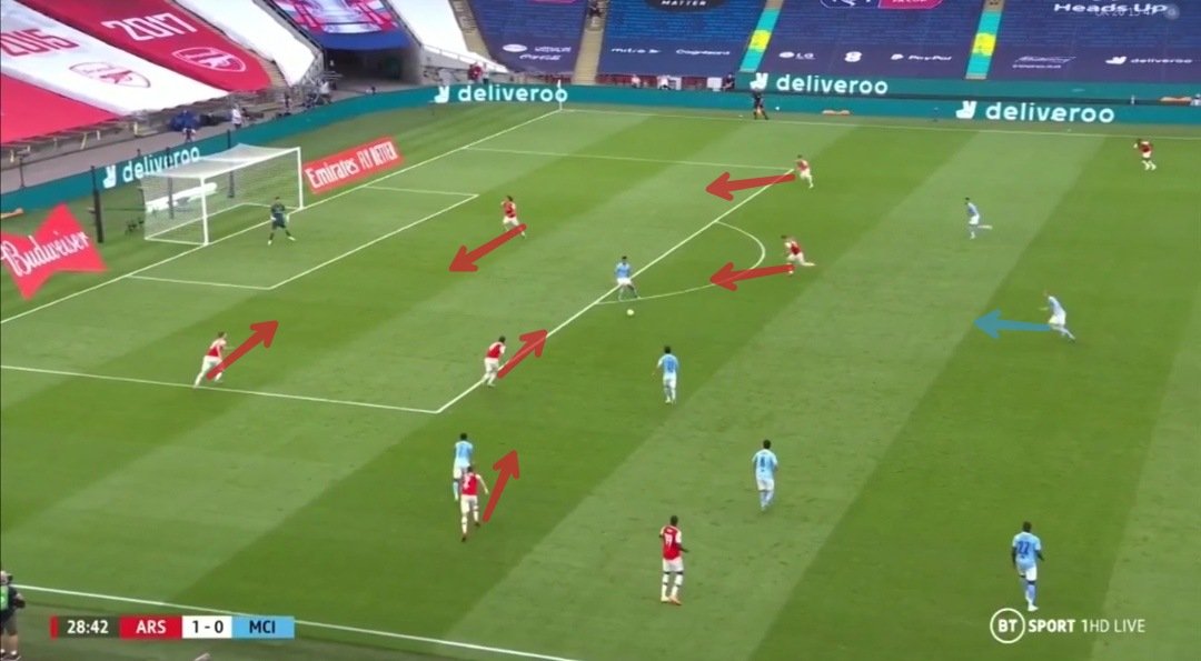 هنا صور للممارسة ارسنال لضغط منخفض، وتواجد 10 لاعبين أمام الكرة، بما فيهم ثلاثي خط المقدمة لإغلاق المساحات بالعمق وعلى الأطراف وتعقيد المهمة الهجومية بالنسبة للسيتي