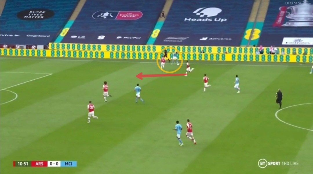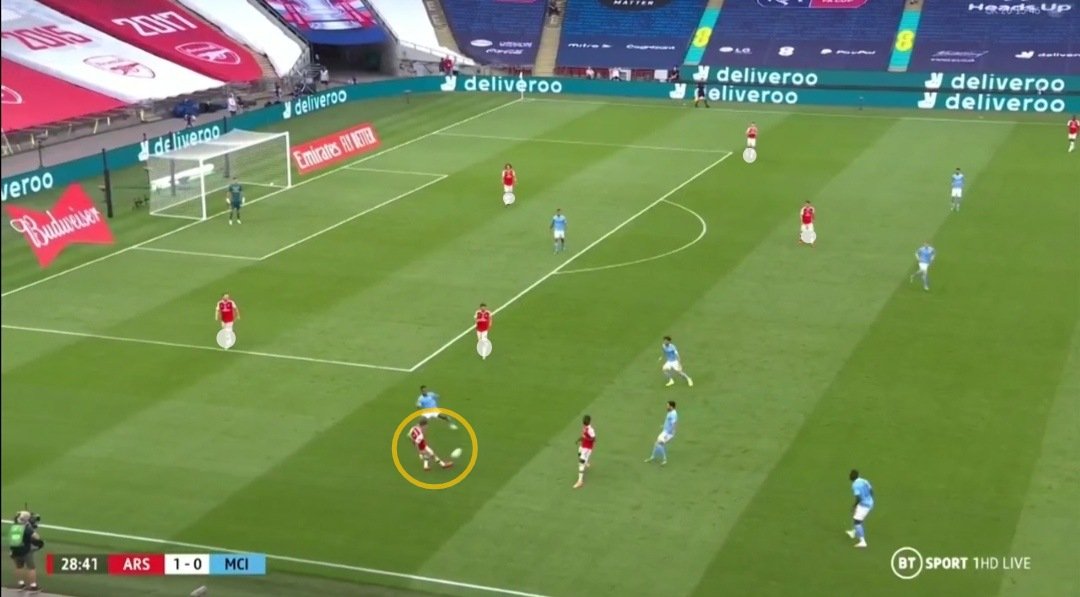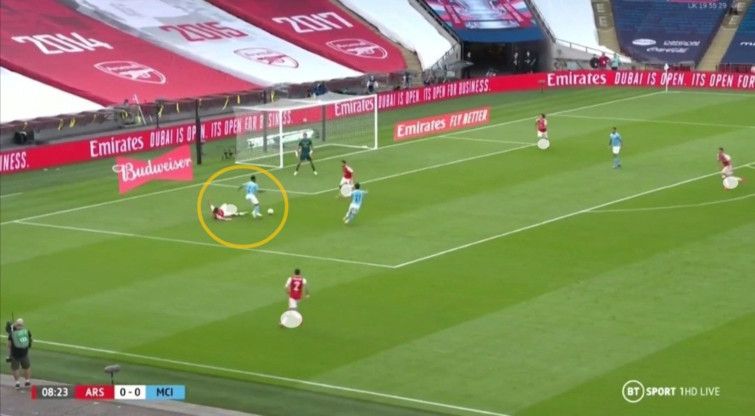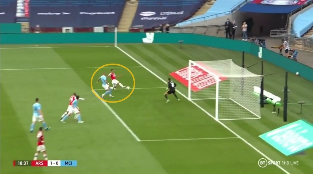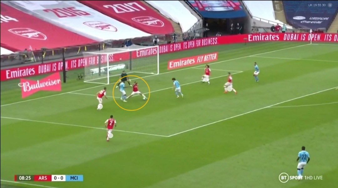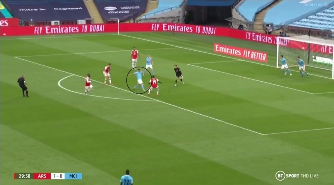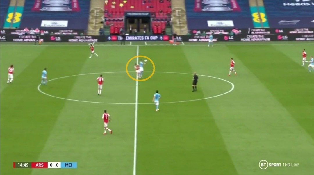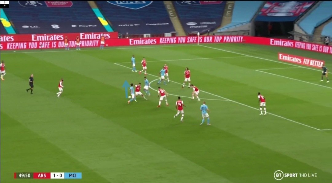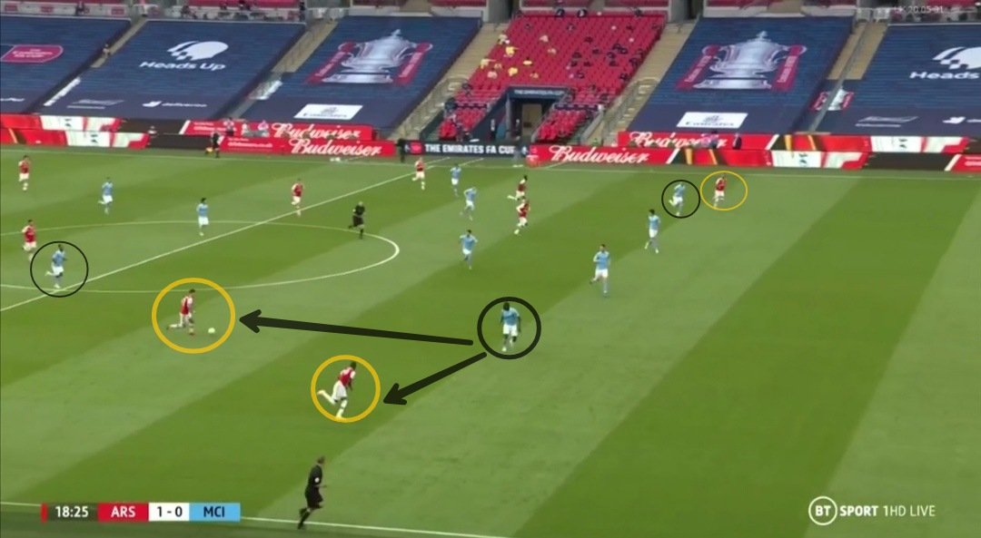 كرة أخرى ، ثلاثي خط المقدمة يضغط وكل لاعب يضغط على الاعب المكلف بمراقبته، جارسيا يضطر اعادة الكرة إلى الحارس، ايديرسون حاول التمرير إلى دي بروين، شاكا يضغط ويخطف الكرة، وصلت ل اوباميانج حاول تمريرها في المساحة لشاكا، لكن شاكا تأخر في التحرك، عاد جوندوجان لقطع الكرة