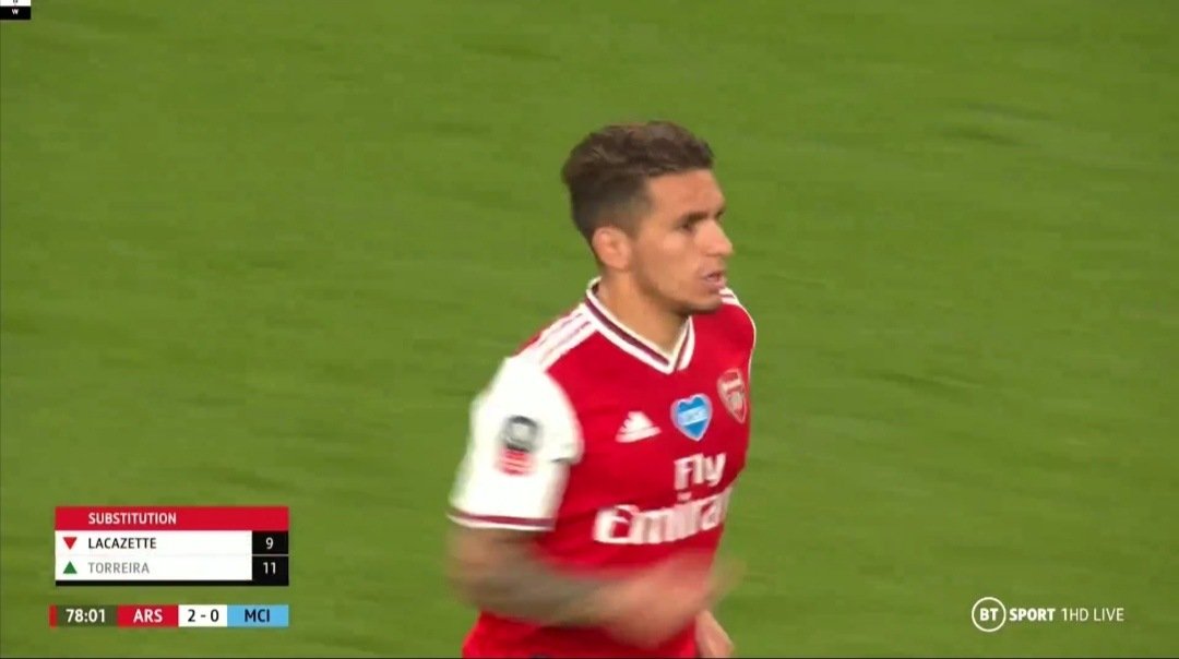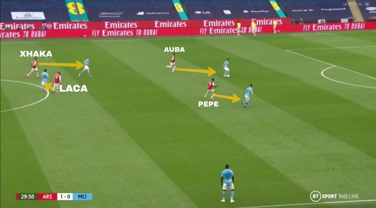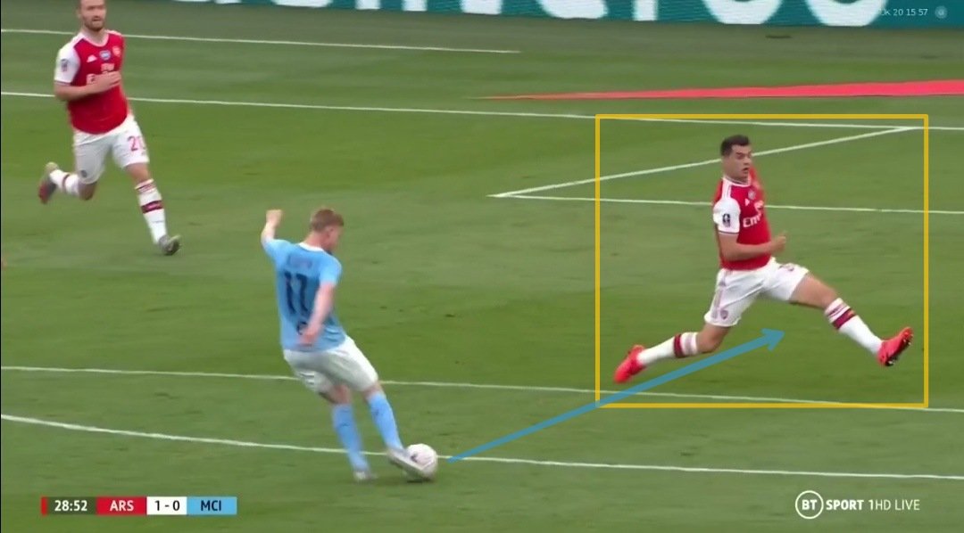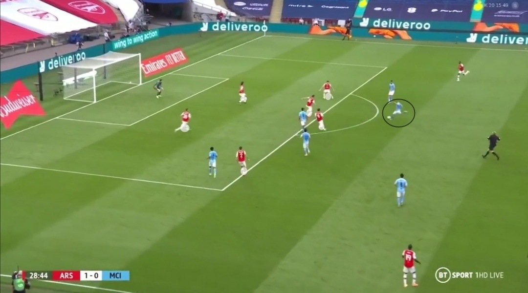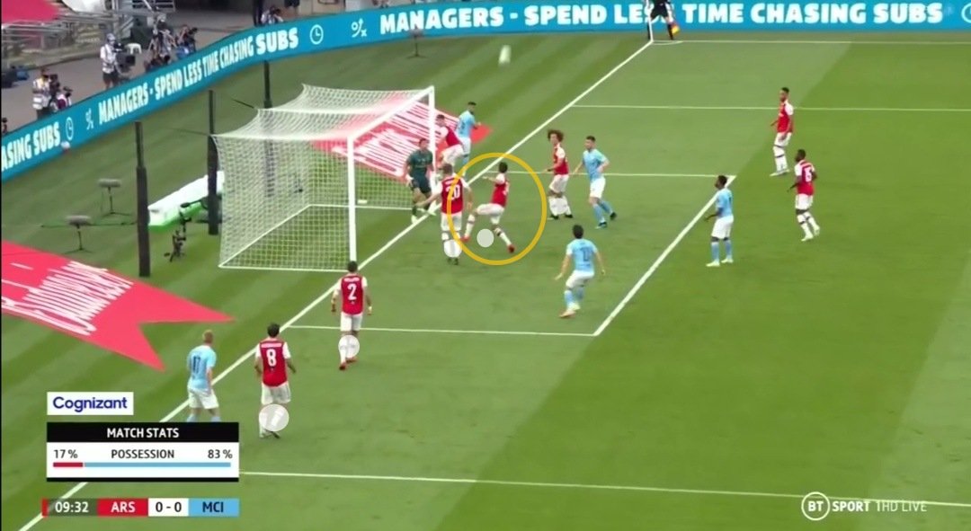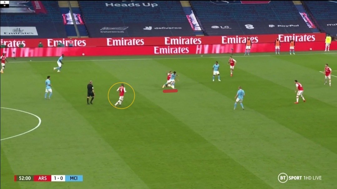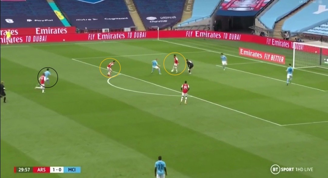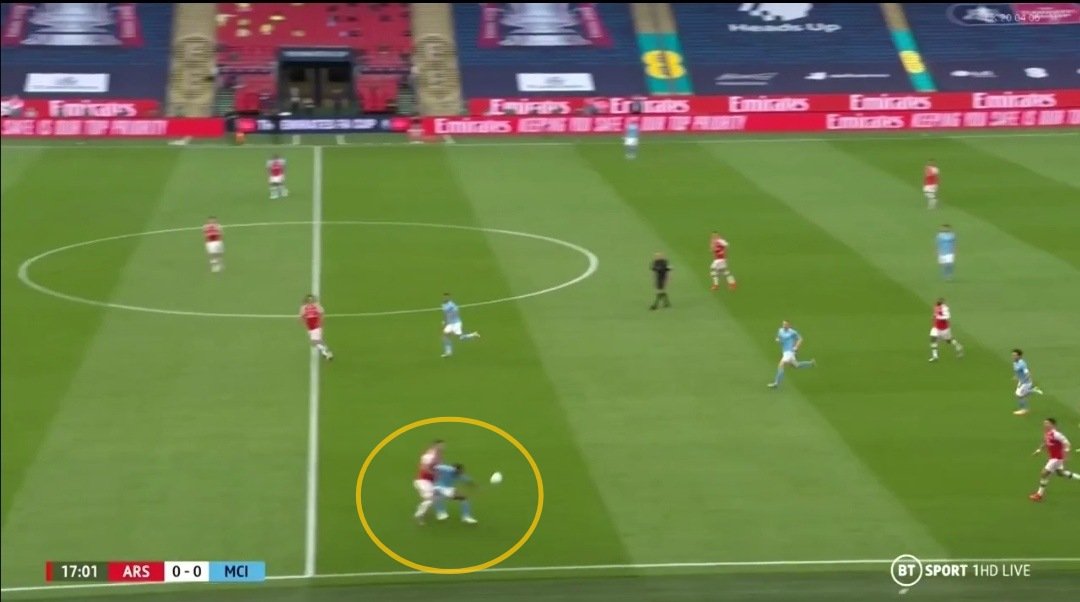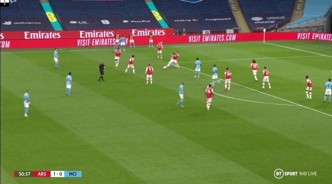 كرة أخرى ، ثلاثي خط المقدمة يضغط وكل لاعب يضغط على الاعب المكلف بمراقبته، جارسيا يضطر اعادة الكرة إلى الحارس، ايديرسون حاول التمرير إلى دي بروين، شاكا يضغط ويخطف الكرة، وصلت ل اوباميانج حاول تمريرها في المساحة لشاكا، لكن شاكا تأخر في التحرك، عاد جوندوجان لقطع الكرة