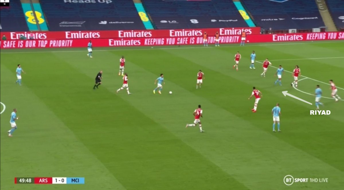 بعد ضغط ارسنال العالي، والكرة الطويلة في الإمام لرياض على الطرف، تيرني يضغط، ونيلز ياخذ مكانه. وبعد لحظات بسيطة جميع لاعبي ارسنال يعودون ليأخذوا مواقعهم الدفاعية.