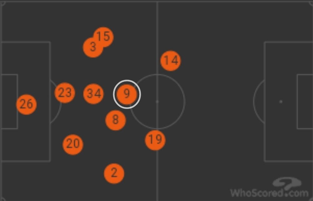 ديفيد سيلفا يستلم الكرة خلف بيبي و أمام سيبايوس بمسافة، ودي بروين يميل لليمين بعيدا عن شاكا، خلف اوباميانج وأمام نيلز. ورياض يتحرك من اليمن لليسار ليفلت من رقابة نيلز ويمنح خيار تمرير لديفيد سيلفا خلف سيبايوس