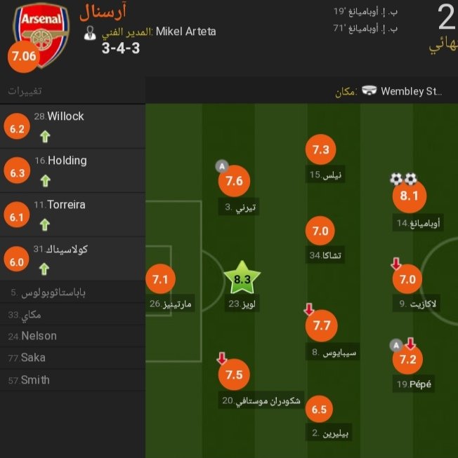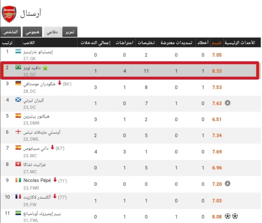 نال أعلى درجة تقيم 8.88 أعلى من اوباميانج نفسه 8.08 صاحب هدفي المباراة الوحيدين