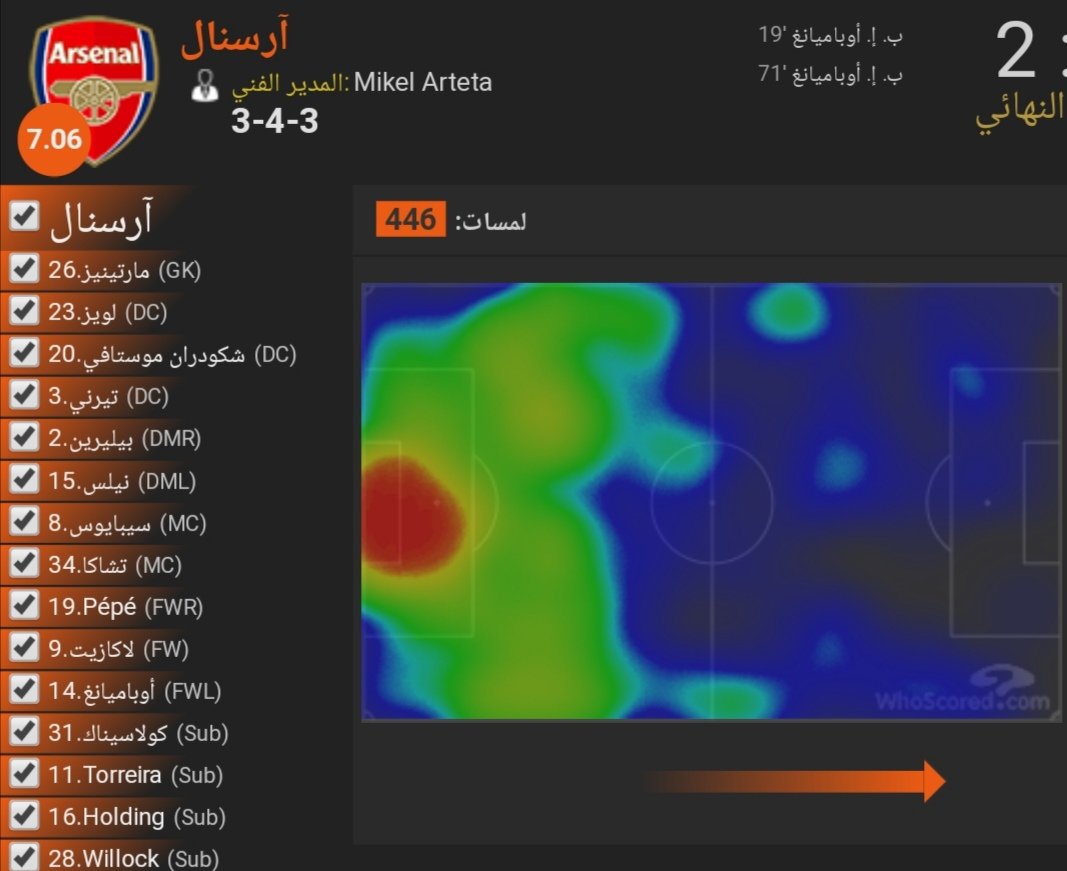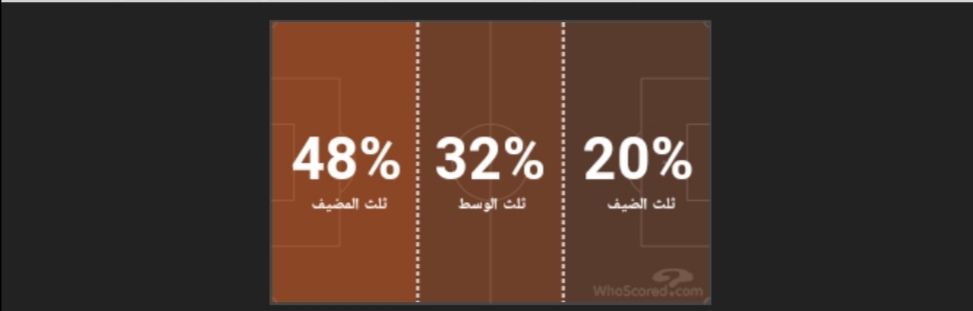 اللون الأحمر يشير إلى أكثر المناطق نشاطا لارسنال وهي منطقة عمق الدفاع ثم اللون الأصفر ثم الأخضر 'النصف الدفاعي' ثم الأزرق 'النصف الهجومي'