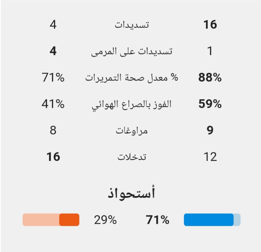 نسبة استحواذ الفريق على الكرة 29% فقط