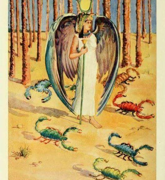 5-الست طبعا معرفتش تعمل إيه وفضلت تجري على بيت بيت لكن كل البيوت قفلت الباب ف وشها خوف من العقارب وانتقامهم لما سمعت ايزيس اللي حصل قررت تساعد الطفل وابتدت تساعده بطقوس سحرية فقالت أسماء العقارب السبعة كلهم وسيطرت بقوتها عليهم وقدرت تشفي الرضيع لأنها ربة للسحر والأمومة والحنان