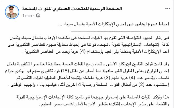 هذا وتؤكد القوات المسلحة على إستمرار جهودها فى تأمين كافة الإتجاهات الإستراتيجية للدولة والقضاء على جذور الإرهاب وإقتلاعه وتوفير الأمن والأمان لشعب مصر العظيم #بئر_العبد #شمال_سيناء