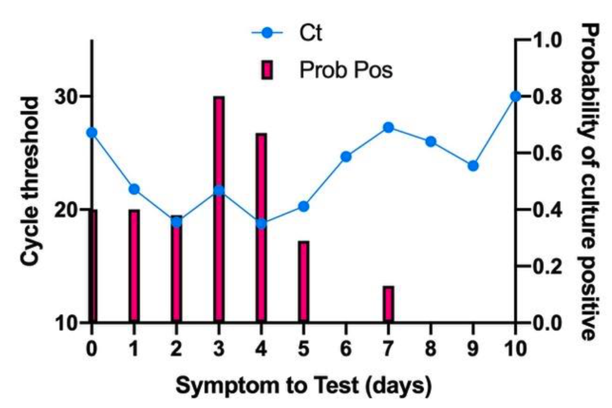 6⃣..وفرصته لنقل العدوى للآخرين تكاد تكون معدومة (ربما كانت الـ Ct في عينته تزيد عن 35 نتيجة لوجود كمية بسيطة من الـ RNA). غالبًا ما يكون الفيروس المعدي غير قابل للعزل من العينة بعد اليوم الثامن، حتى لو كانت نتيجة المسحة إيجابية كما أظهرت هذه الدراسة: