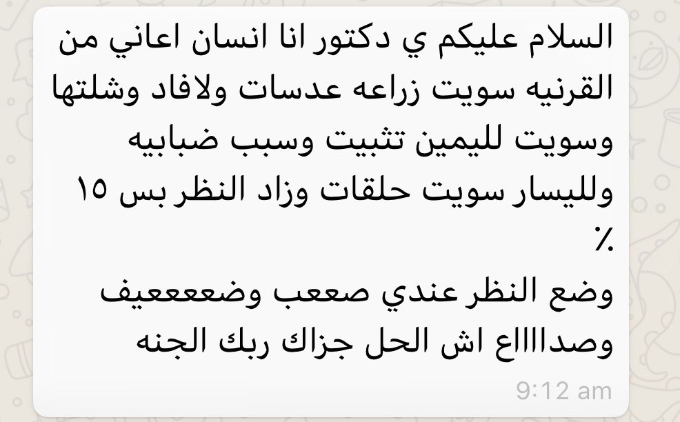 معاناه احد المرضى للاسف !! أسأل الله له التيسير ، ونقول ونكرر للجميع العمل الجراحي اي كان نوعه للاسف لن يحل معك مشكله القرنيه او النظر او يعطيك جوده في الرؤية مثلما توفرها حلول بسيطه جدا كالعدسات اللاصقه الخاصه بالقرنيه المخروطية!