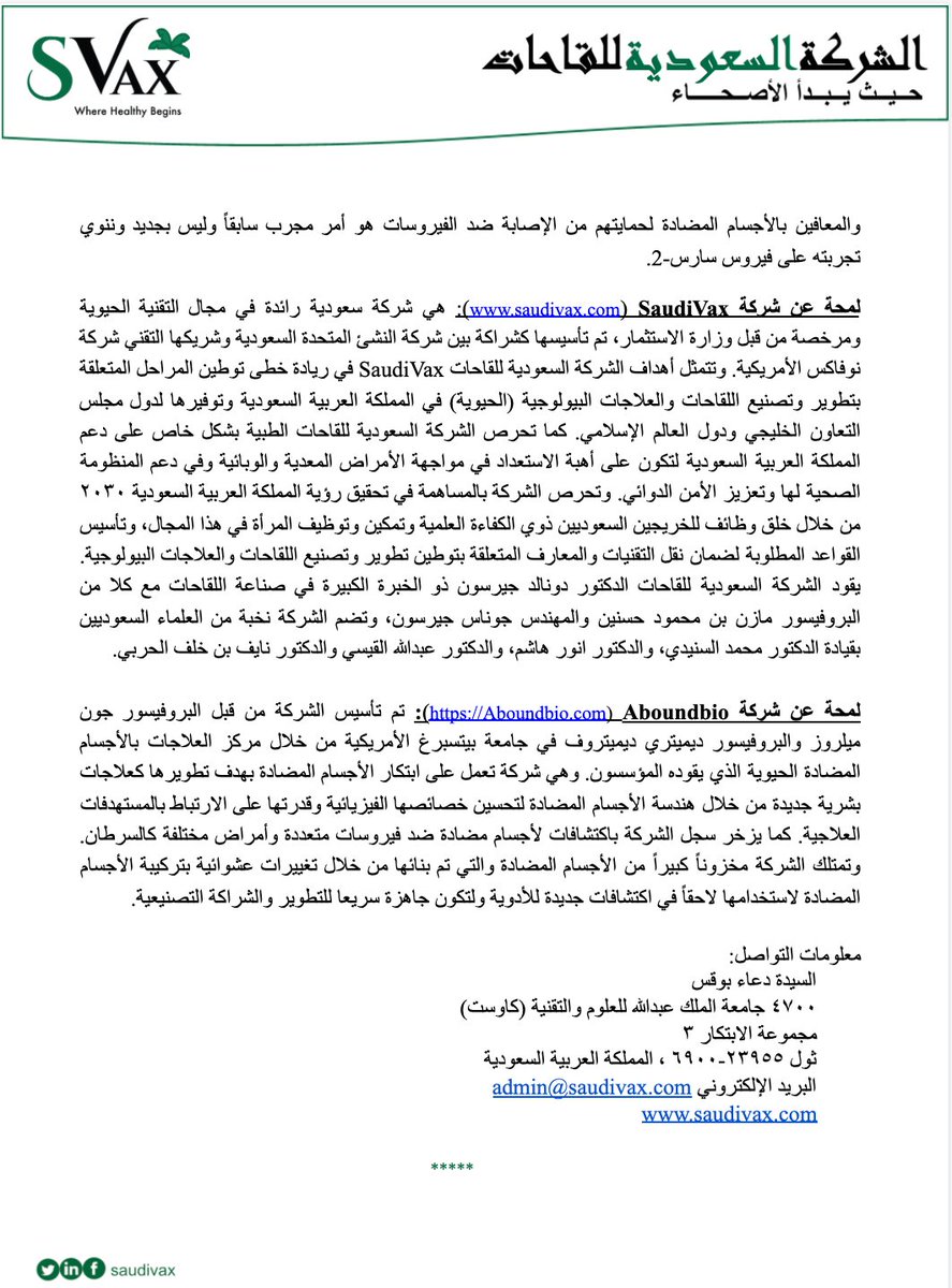 الشركة السعودية للقاحات @saudivax توقع إتفاقية ترخيص لتطوير وتوفير مستحضر طبي بيولوجي (حيوي) مضاد لـ #كورونا بالتعاون مع شركة Abound Bio الأمريكية بعد نجاحهم في تحديد بروتين إستطاع في الإختبارات المعملية القضاء على الفيروس ومنع .يتبع١