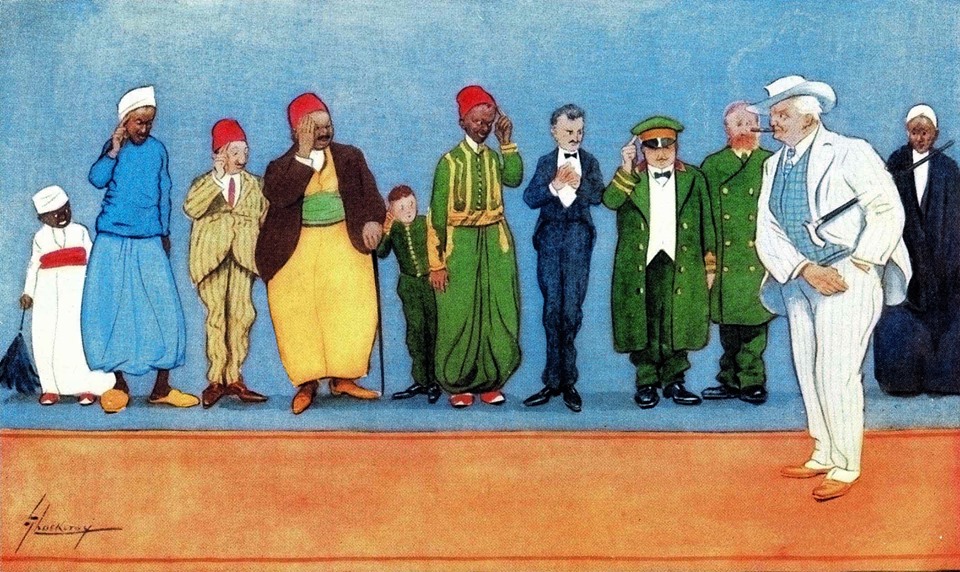 الصورة السابقة سماها لانس ( معركة النيل ) صور فيها تصارع اصحاب الخيول والباعة الجائلين على السياح بينما قوات الشرطة تدفعهم بعيدا وبنفس الحس الساخر ينتقد فى هذة الصورة انتشار طلب البقشيش فرسم العاملين بالفندق فى طابور طويل ينتظر السائح