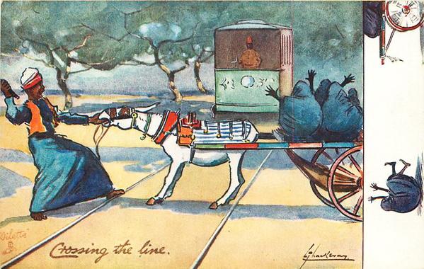 صورة ساخرة لعربة كارو توقفت على شريط الترام ..العربجى يحاول ان يجر الحمار الى الامام لكن الحيوان العنيد حرن والستات تصرخ تنادى سائق الترام قبل ان تقع الحادثة